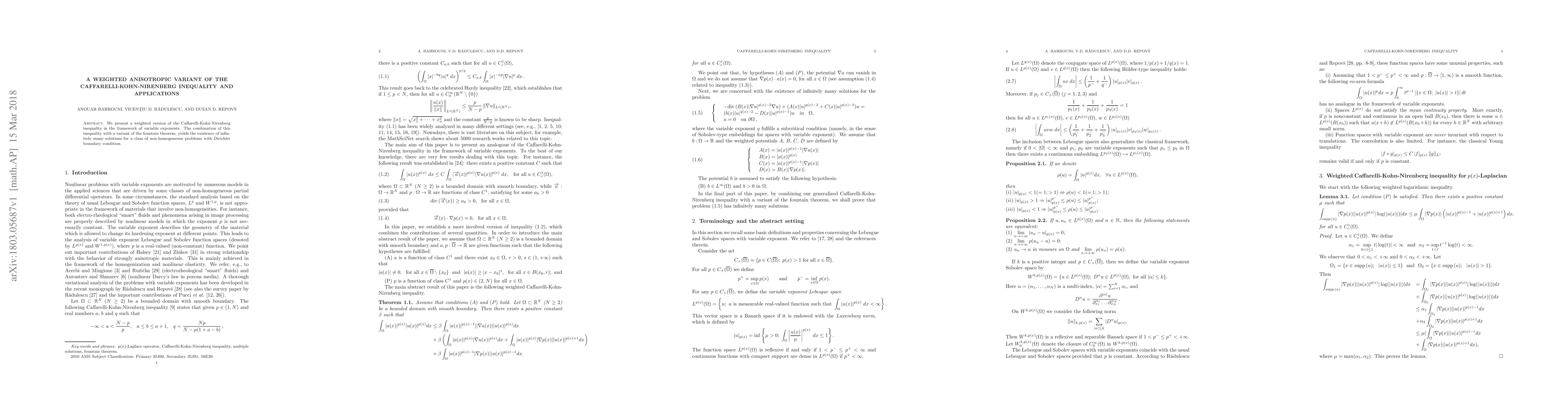 This paper introduces a weighted, anisotropic form of the Caffarelli-Kohn-Nirenberg inequality for variable exponents, leading to the discovery of infinitely many solutions for specific non-homogeneous Dirichlet problems via a modified fountain theorem.