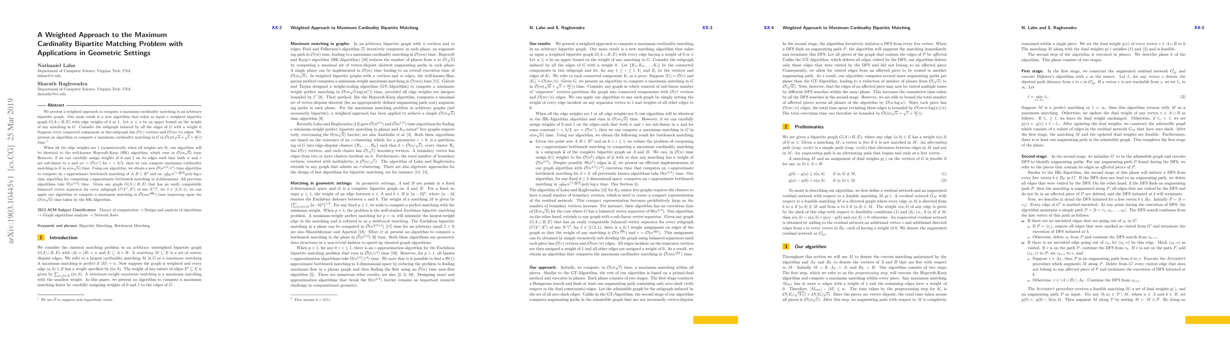 We present a weighted approach to compute a maximum cardinality matching in an arbitrary bipartite graph. Our main result is a new algorithm that takes as input a weighted bipartite graph $G(A\cup B,E)$ with edge weights of $0$ or $1$. Let $w \leq n$ be an upper bound on the weight of any matching in $G$. Consider the subgraph induced by all the edges of $G$ with a weight $0$. Suppose every connected component in this subgraph has $\mathcal{O}(r)$ vertices and $\mathcal{O}(mr/n)$ edges. We present an algorithm to compute a maximum cardinality matching in $G$ in $\tilde{\mathcal{O}}( m(\sqrt{w}+ \sqrt{r}+\frac{wr}{n}))$ time. When all the edge weights are $1$ (symmetrically when all weights are $0$), our algorithm will be identical to the well-known Hopcroft-Karp (HK) algorithm, which runs in $\mathcal{O}(m\sqrt{n})$ time. However, if we can carefully assign weights of $0$ and $1$ on its edges such that both $w$ and $r$ are sub-linear in $n$ and $wr=\mathcal{O}(n^{\gamma})$ for $\gamma < 3/2$, then we can compute maximum cardinality matching in $G$ in $o(m\sqrt{n})$ time. Using our algorithm, we obtain a new $\tilde{\mathcal{O}}(n^{4/3}/\varepsilon^4)$ time algorithm to compute an $\varepsilon$-approximate bottleneck matching of $A,B\subset\mathbb{R}^2$ and an $\frac{1}{\varepsilon^{\mathcal{O}(d)}}n^{1+\frac{d-1}{2d-1}}\mathrm{poly}\log n$ time algorithm for computing $\varepsilon$-approximate bottleneck matching in $d$-dimensions. All previous algorithms take $\Omega(n^{3/2})$ time. Given any graph $G(A \cup B,E)$ that has an easily computable balanced vertex separator for every subgraph $G'(V',E')$ of size $|V'|^{\delta}$, for $\delta\in [1/2,1)$, we can apply our algorithm to compute a maximum matching in $\tilde{\mathcal{O}}(mn^{\frac{\delta}{1+\delta}})$ time improving upon the $\mathcal{O}(m\sqrt{n})$ time taken by the HK-Algorithm.