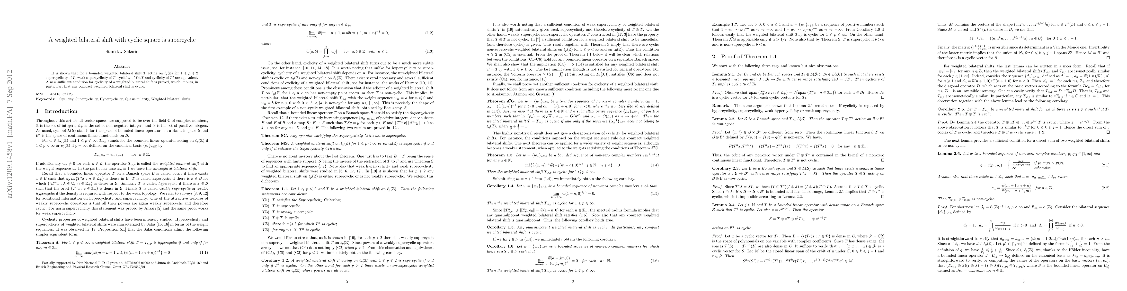 It is shown that for a bounded weighted bilateral shift $T$ acting on $\ell_p(\Z)$ for $1\leq p\leq 2$ supercyclicity of $T$, weak supercyclicity of $T$, cyclicity of $T\oplus T$ and cyclicity of $T^2$ are equivalent. A new sufficient condition for cyclicity of a weighted bilateral shift is proved, which implies, in particular, that any compact weighted bilateral shift is cyclic.