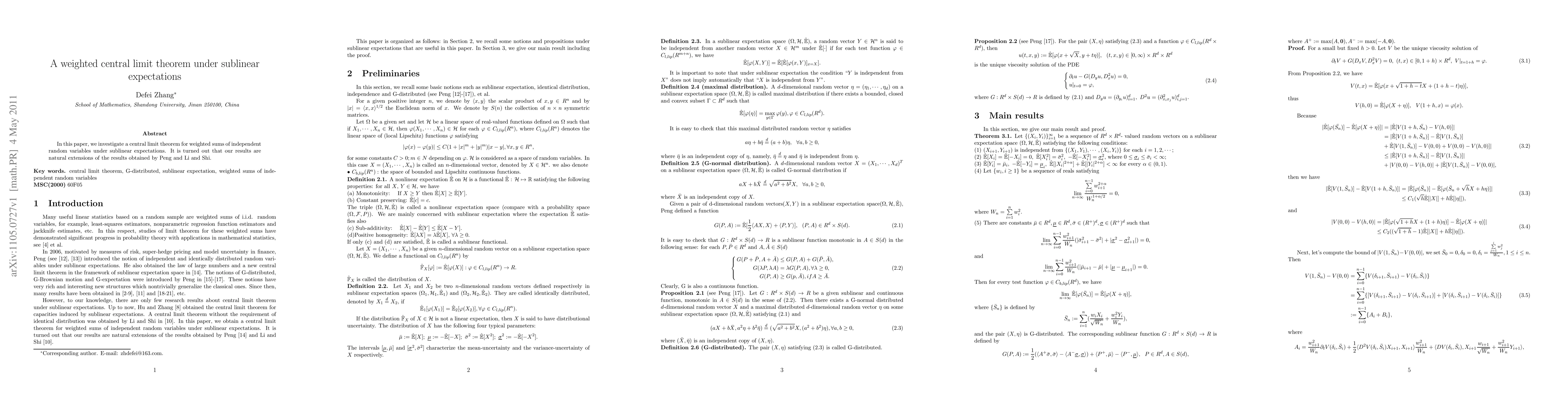 Summary: This paper extends the central limit theorem for weighted sums of independent random variables under sublinear expectations, building on prior work by Peng, Li, and Shi. The findings provide a natural progression in this area of probabilistic theory.