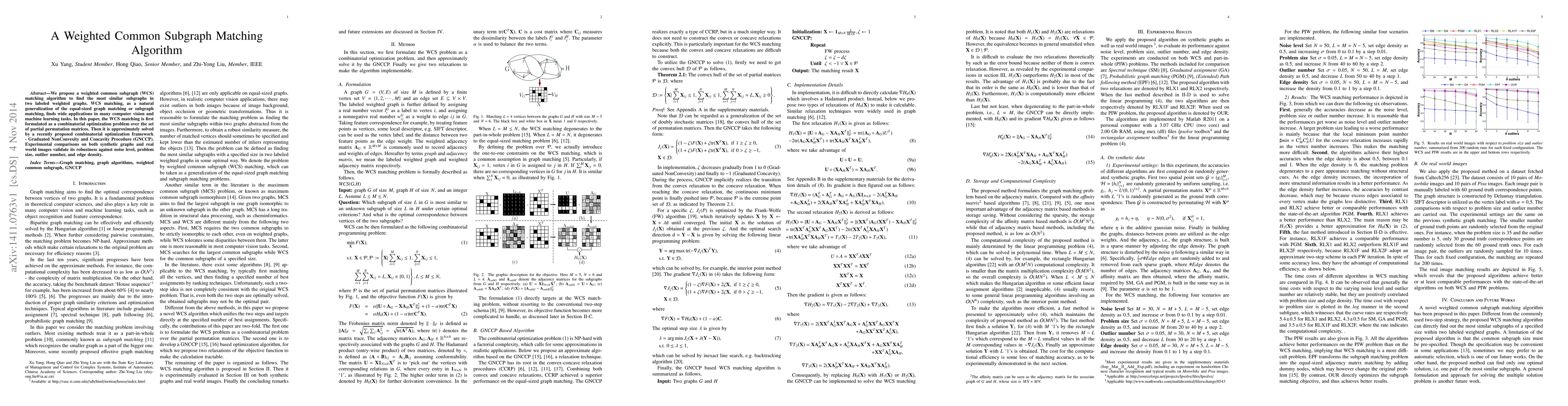 This paper introduces a weighted common subgraph (WCS) matching algorithm to identify the most similar subgraphs in two labeled weighted graphs, formulated as a combinatorial optimization problem. The algorithm employs the Graduated NonConvexity and Concavity Procedure (GNCCP) for approximate solutions and demonstrates robustness through experiments on synthetic and real-world images.