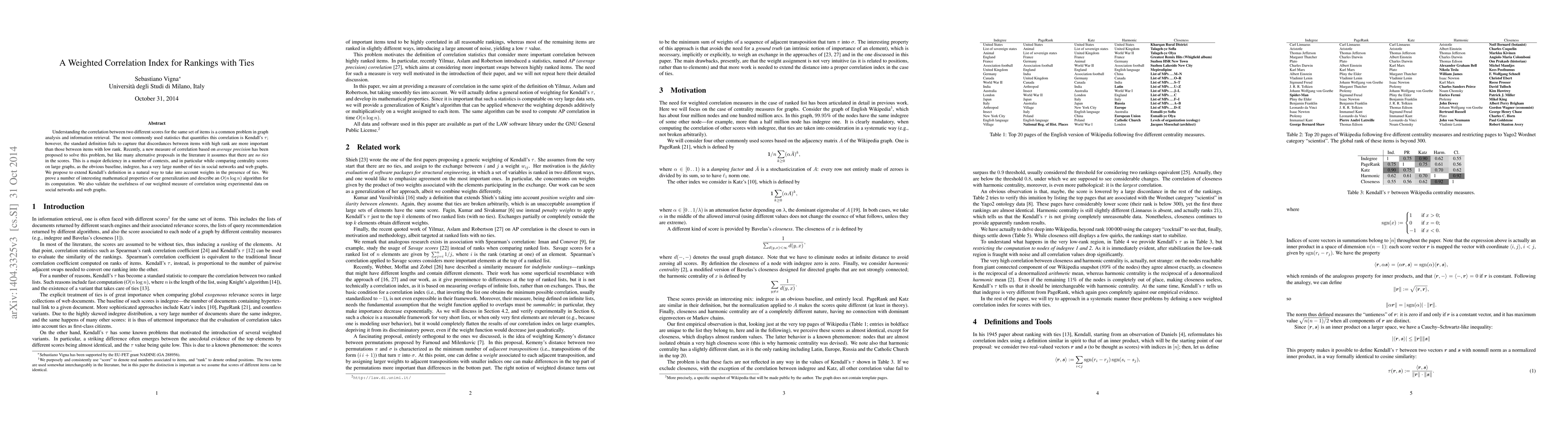 Understanding the correlation between two different scores for the same set of items is a common problem in information retrieval, and the most commonly used statistics that quantifies this correlation is Kendall's $\tau$. However, the standard definition fails to capture that discordances between items with high rank are more important than those between items with low rank. Recently, a new measure of correlation based on average precision has been proposed to solve this problem, but like many alternative proposals in the literature it assumes that there are no ties in the scores. This is a major deficiency in a number of contexts, and in particular while comparing centrality scores on large graphs, as the obvious baseline, indegree, has a very large number of ties in web and social graphs. We propose to extend Kendall's definition in a natural way to take into account weights in the presence of ties. We prove a number of interesting mathematical properties of our generalization and describe an $O(n\log n)$ algorithm for its computation. We also validate the usefulness of our weighted measure of correlation using experimental data.