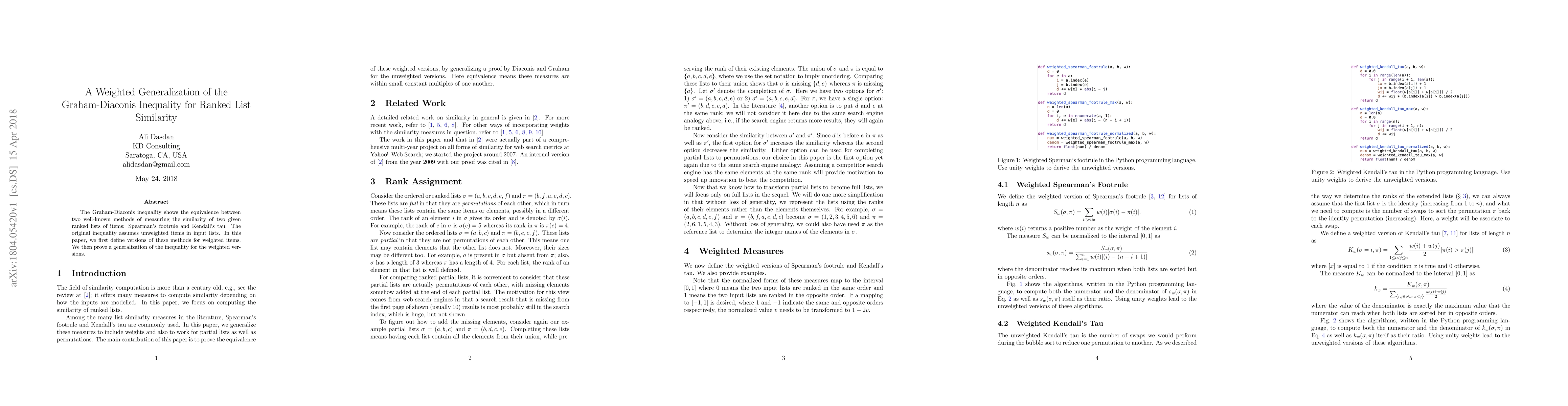 The paper defines weighted versions of Kendall's tau and Spearman's footrule for ranked lists, generalizing the Graham-Diaconis inequality to accommodate weighted items.