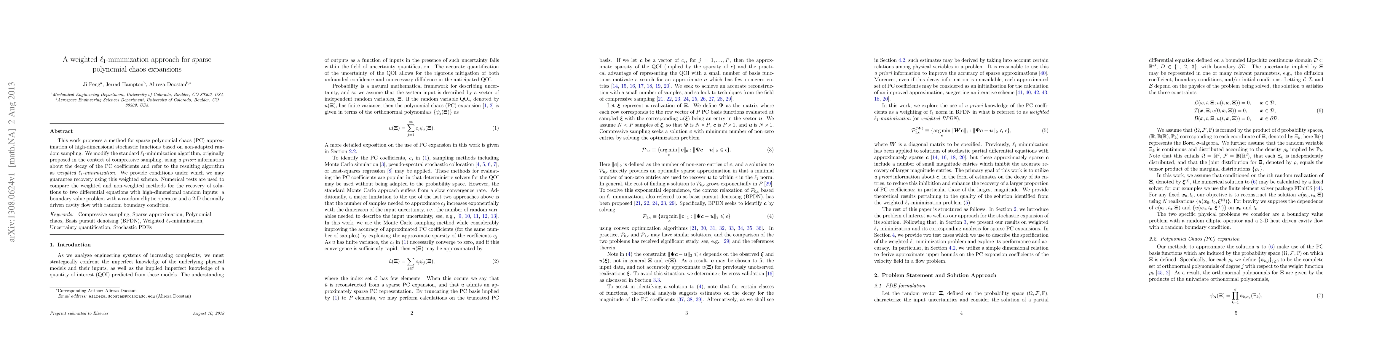This work proposes a method for sparse polynomial chaos (PC) approximation of high-dimensional stochastic functions based on non-adapted random sampling. We modify the standard l1 -minimization algorithm, originally proposed in the context of compressive sampling, using a priori information about the decay of the PC coefficients and refer to the resulting algorithm as weighted l1 -minimization. We provide conditions under which we may guarantee recovery using this weighted scheme. Numerical tests are used to compare the weighted and non-weighted methods for the recovery of solutions to two differential equations with high-dimensional random inputs: a boundary value problem with a random elliptic operator and a 2-D thermally driven cavity flow with random boundary condition.