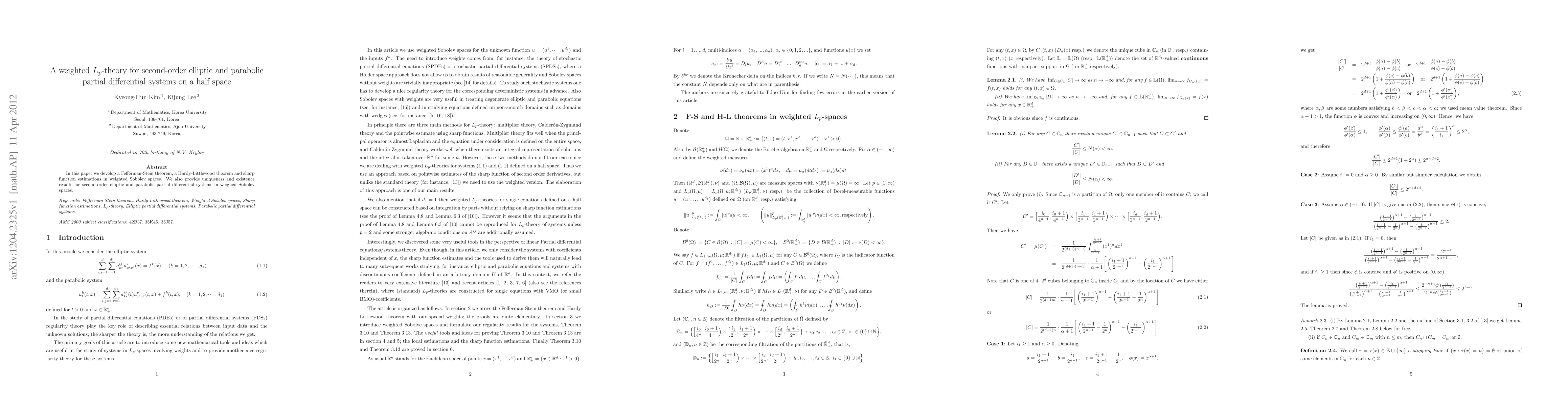 In this paper we develop a Fefferman-Stein theorem, a Hardy-Littlewood theorem and sharp function estimations in weighted Sobolev spaces. We also provide uniqueness and existence results for second-order elliptic and parabolic partial differential systems in weighed Sobolev spaces.