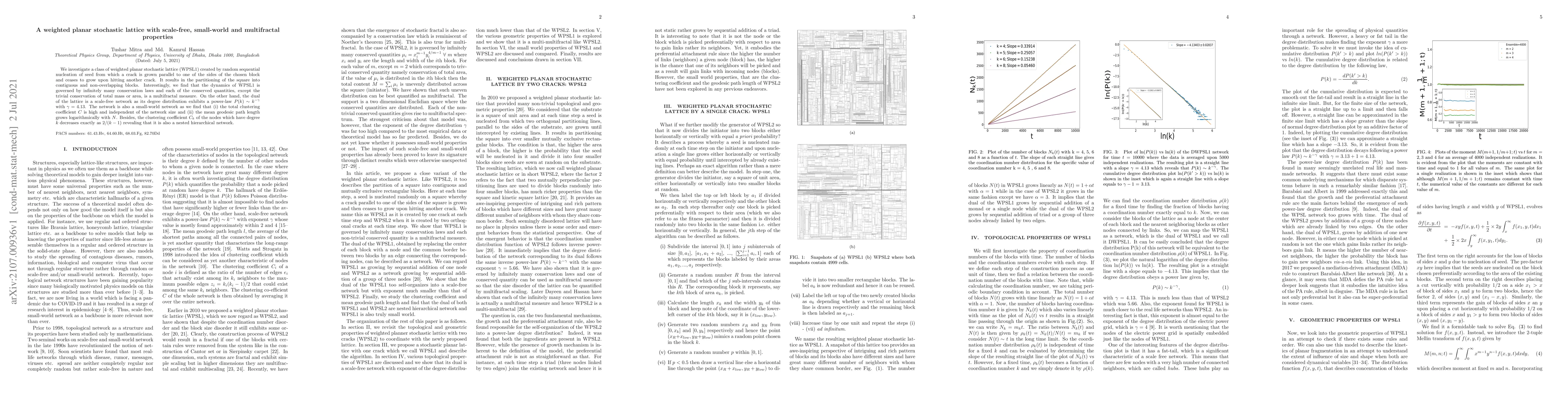This paper explores a weighted planar stochastic lattice (WPSL1) formed by random crack growth, revealing multifractal conserved quantities and scale-free, small-world, and nested hierarchical network properties. The dual network exhibits a power-law degree distribution and a high clustering coefficient with logarithmic mean path length.