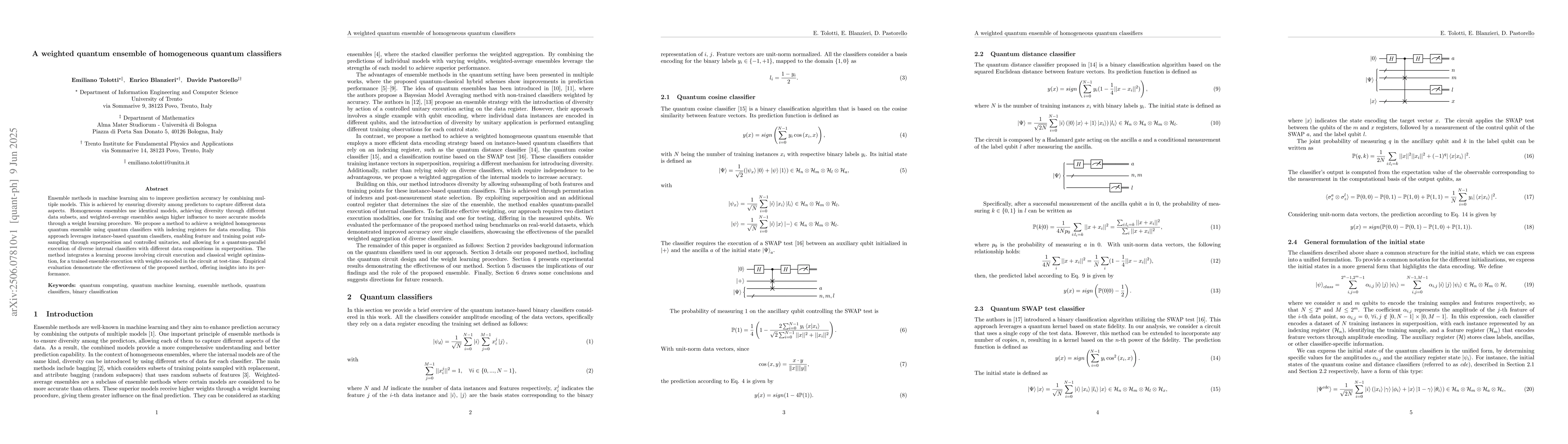 This research introduces a weighted quantum ensemble method for homogeneous quantum classifiers, using quantum classifiers with indexing registers for data encoding. The method leverages quantum parallelism to execute diverse classifiers on subsampled data, and integrates a learning process with circuit execution and classical weight optimization. Empirical results showcase the effectiveness of this approach, offering insights into its performance for enhanced machine learning predictions.