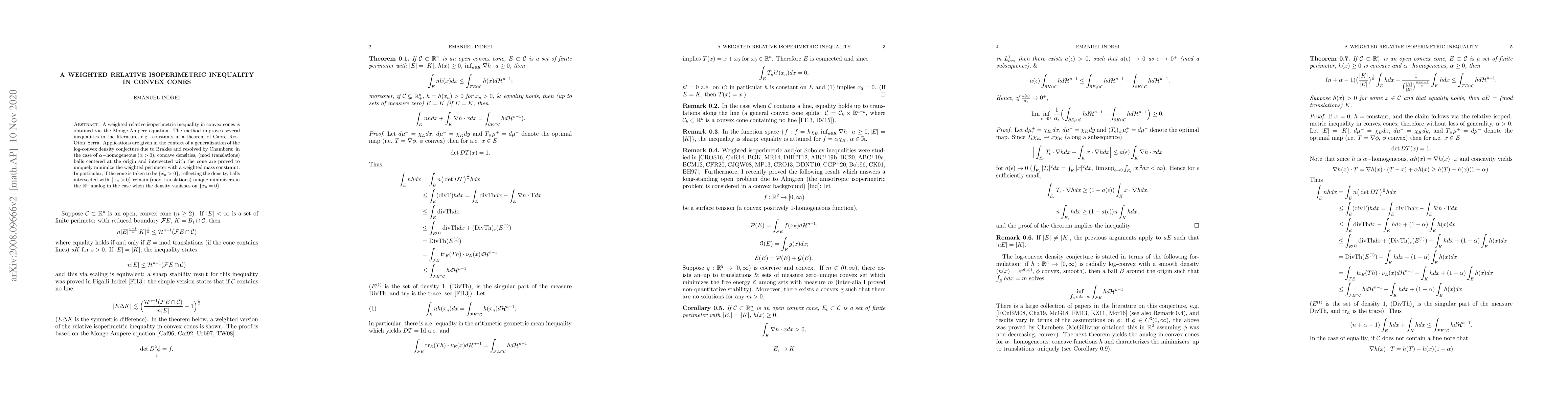 This paper establishes a weighted relative isoperimetric inequality in convex cones using the Monge-Ampere equation, improving existing inequalities. It applies this result to prove that balls uniquely minimize weighted perimeter under $\alpha$-homogeneous, concave density constraints, resolving a generalization of the log-convex density conjecture.