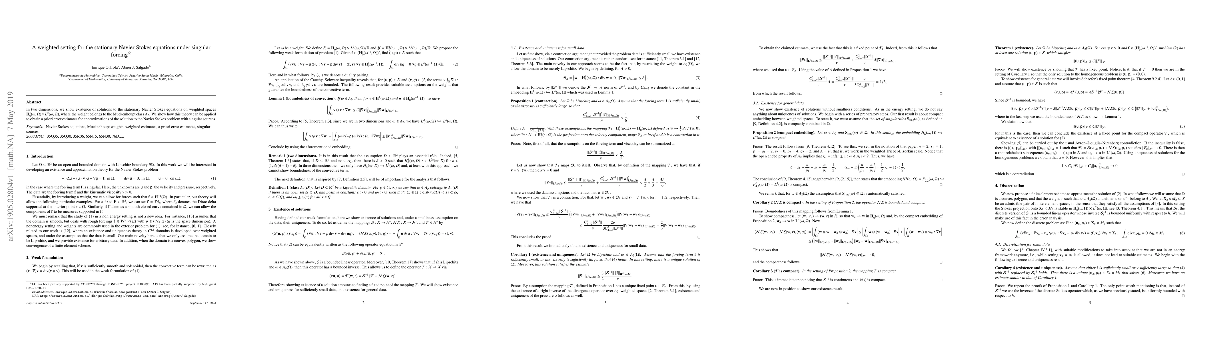 Researchers prove existence of solutions to stationary Navier Stokes equations on weighted spaces with a specific weight class, enabling priori error estimates for approximations of the solution with singular sources.
