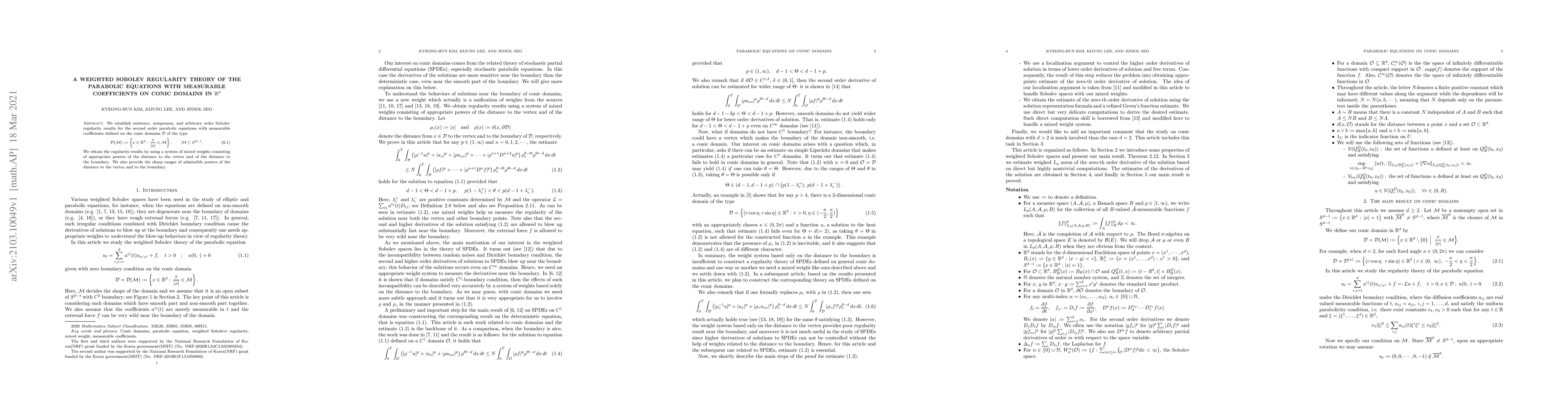 We establish existence, uniqueness, and arbitrary order Sobolev regularity results for the second order parabolic equations with measurable coefficients defined on the conic domains $D$ of the type $$ D(M):=\left\{x\in R^d :\,\frac{x}{|x|}\in M\right\}, \quad \quad M \subset S^{d-1}. $$ We obtain the regularity results by using a system of mixed weights consisting of appropriate powers of the distance to the vertex and of the distance to the boundary. We also provide the sharp ranges of admissible powers of the distance to the vertex and to the boundary.