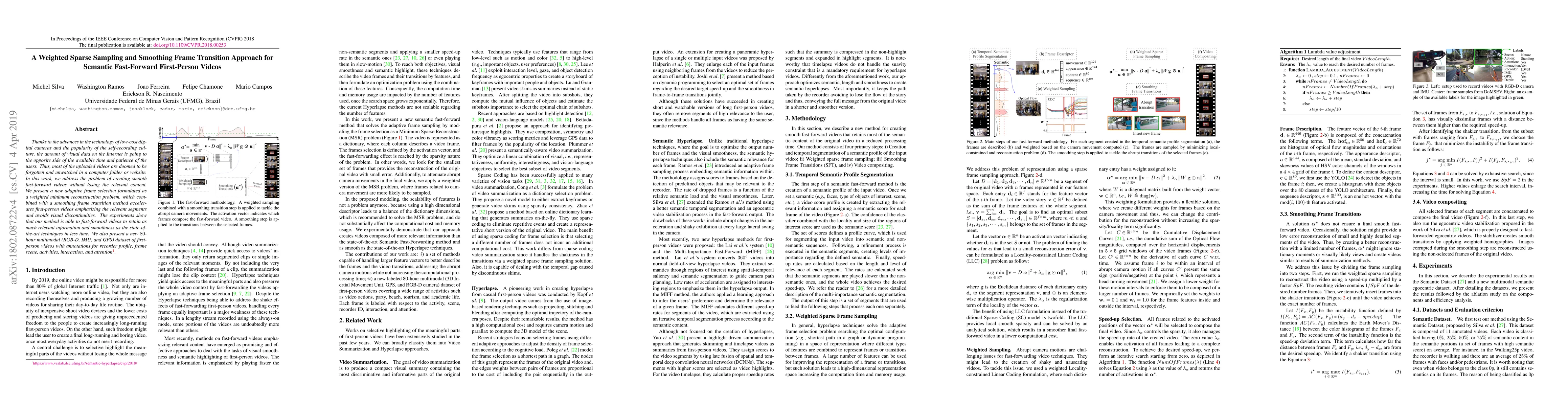 This paper proposes a novel adaptive frame selection method for fast-forwarding first-person videos, emphasizing relevant content while minimizing visual discontinuities. The approach combines weighted sparse sampling and smoothing transitions, outperforming state-of-the-art techniques in retaining information. Additionally, it introduces a new multimodal dataset for first-person video research.