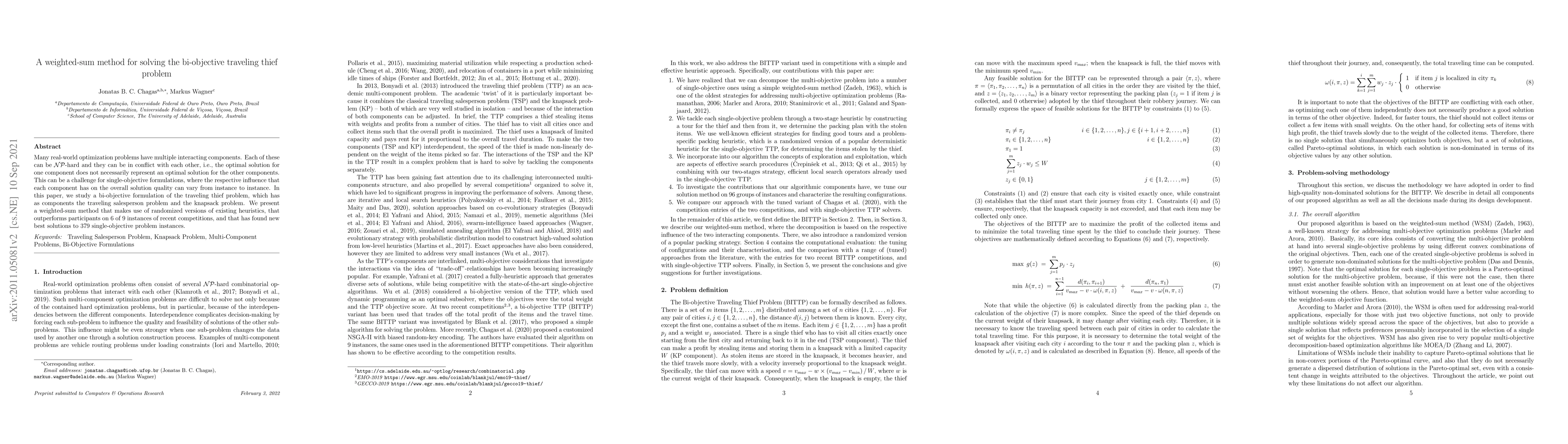 This paper proposes a weighted-sum method for solving the bi-objective traveling thief problem, combining the traveling salesperson and knapsack problems. The method uses randomized heuristics and outperforms competitors on 6 out of 9 recent competition instances, finding new best solutions for 379 single-objective problem instances.