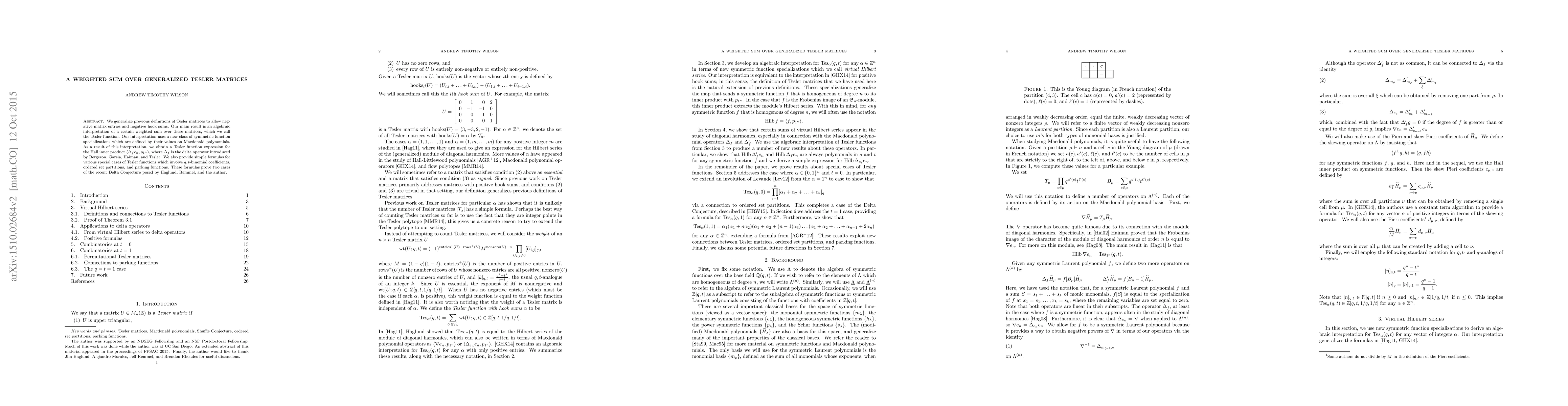 This paper generalizes Tesler matrices to include negative entries and hook sums, introducing a new algebraic interpretation of a weighted sum over these matrices termed the Tesler function. The study provides expressions for the Hall inner product and proves special cases of the Delta Conjecture using $q,t$-binomial coefficients and related combinatorial structures.