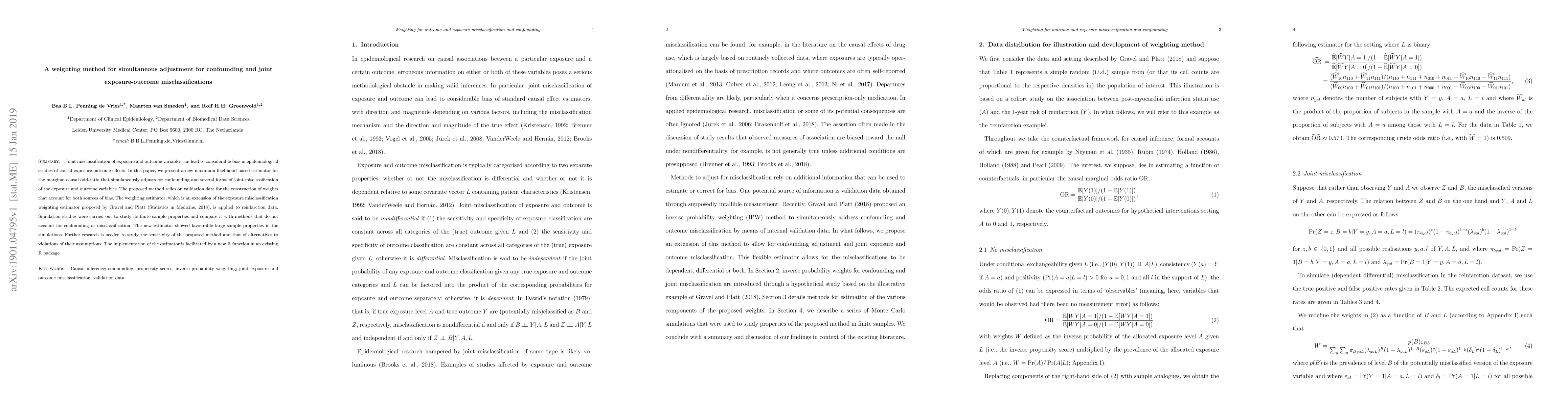 Joint misclassification of exposure and outcome variables can lead to considerable bias in epidemiological studies of causal exposure-outcome effects. In this paper, we present a new maximum likelihood based estimator for the marginal causal odd-ratio that simultaneously adjusts for confounding and several forms of joint misclassification of the exposure and outcome variables. The proposed method relies on validation data for the construction of weights that account for both sources of bias. The weighting estimator, which is an extension of the exposure misclassification weighting estimator proposed by Gravel and Platt (Statistics in Medicine, 2018), is applied to reinfarction data. Simulation studies were carried out to study its finite sample properties and compare it with methods that do not account for confounding or misclassification. The new estimator showed favourable large sample properties in the simulations. Further research is needed to study the sensitivity of the proposed method and that of alternatives to violations of their assumptions. The implementation of the estimator is facilitated by a new R function in an existing R package.