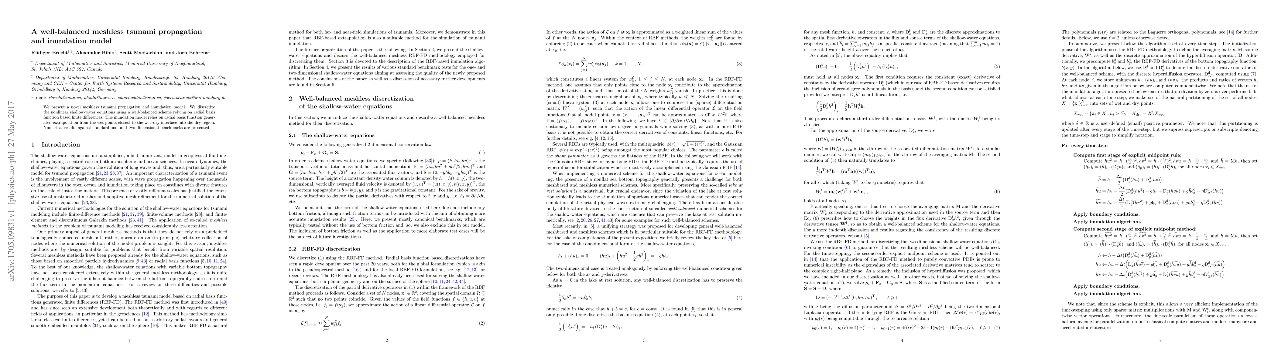 We present a novel meshless tsunami propagation and inundation model. We discretize the nonlinear shallow-water equations using a well-balanced scheme relying on radial basis function based finite differences. The inundation model relies on radial basis function generated extrapolation from the wet points closest to the wet-dry interface into the dry region. Numerical results against standard one- and two-dimensional benchmarks are presented.