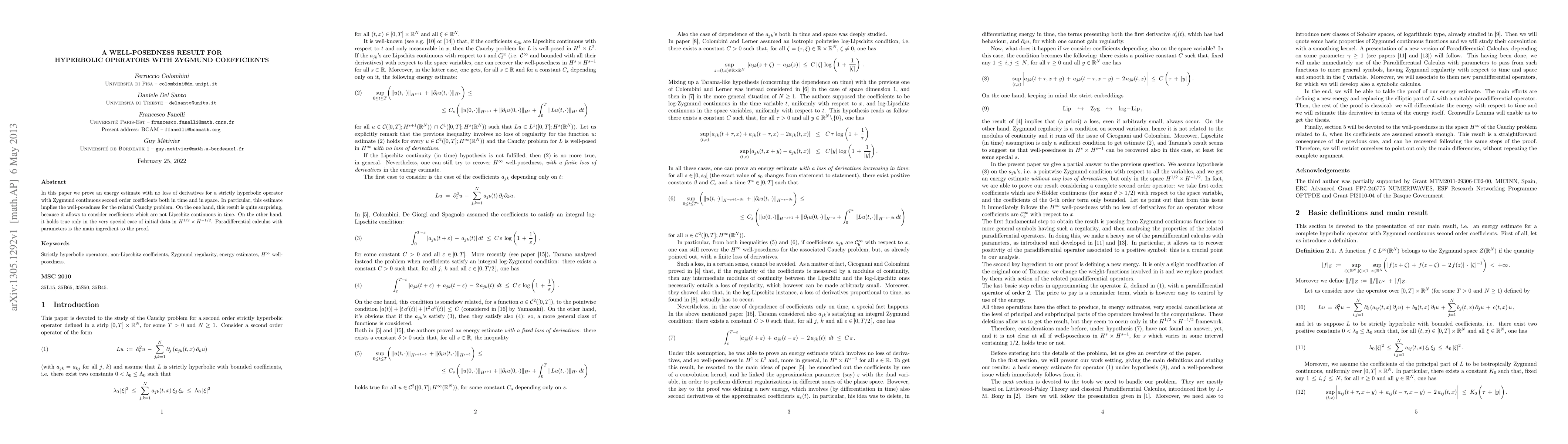 This paper establishes an energy estimate with no loss of derivatives for a strictly hyperbolic operator with Zygmund continuous coefficients, proving well-posedness for the associated Cauchy problem under specific initial data conditions. The result leverages paradifferential calculus with parameters and is notable for handling non-Lipschitz continuous coefficients.