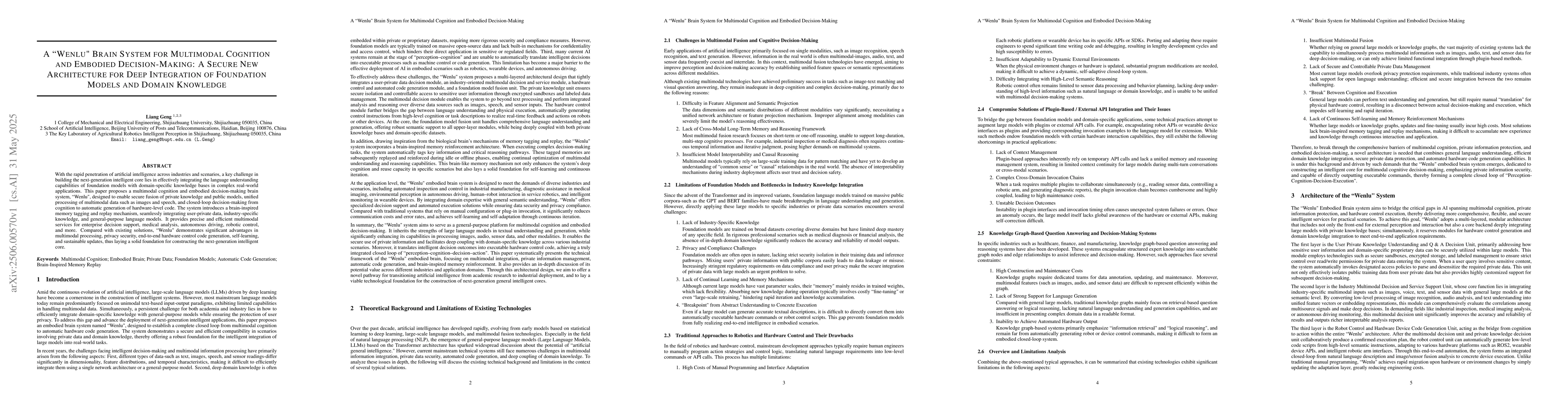 A new brain-inspired system called Wenlu integrates language understanding with domain-specific knowledge for secure multimodal cognition and decision-making. It offers advantages in processing, privacy security, hardware control code generation, self-learning, and updates, laying the foundation for next-generation intelligent systems.