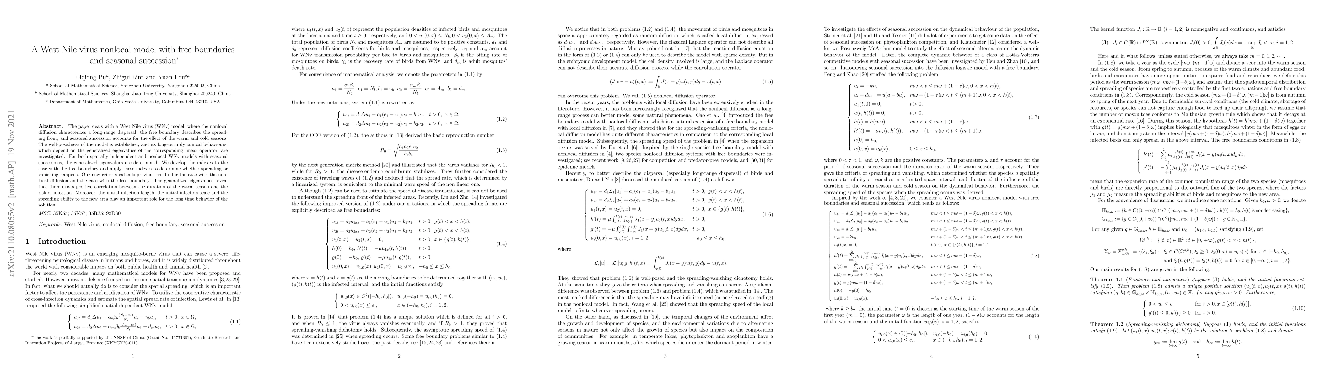 The paper deals with a West Nile virus (WNv) model, where the nonlocal diffusion is introduced to characterize a long-range dispersal, the free boundary is used to describe the spreading front, and seasonal succession accounts for the effect of the warm and cold seasons. The well-posedness of the model is firstly given, its long-term dynamical behaviours are investigated and depend on the generalized eigenvalues of the corresponding linear operator. For the spatial-independent WNv model with seasonal succession, the generalized eigenvalues are calculated and new properties are found. For the WNv nonlocal model with seasonal succession, the generalized eigenvalues are discussed. We then develop the indexes to the case with the free boundary and further use these indexes to judge whether spreading or vanishing happens. The criteria extends known results for the case with the nonlocal diffusion and the case with the free boundary. Moreover, the generalized eigenvalues reveal that there exists positive correlation between the duration of the warm season and the risk of infection. The index of the nonlocal free boundary problem, which depends on the time $t$, determines the spreading or vanishing of WNv. Moreover, the initial infection length, the initial infection scale and the spreading ability to the new area play an important role for the long time behavior of the solution.