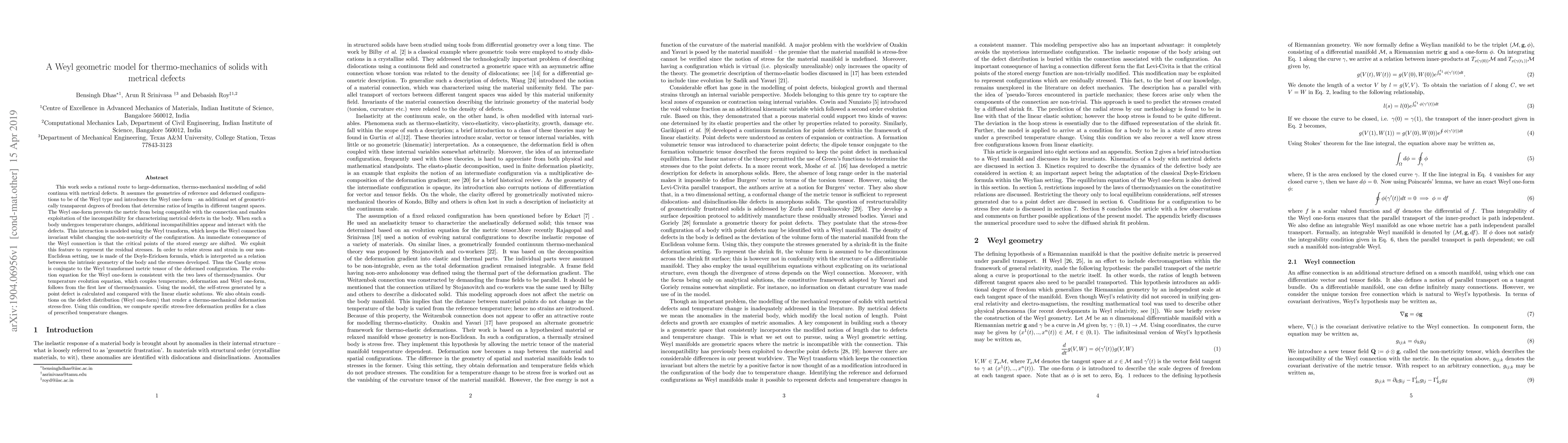 We seek a rational route to large-deformation, thermo-mechanical modeling of solids with metrical defects. It assumes the reference and deformed geometries to be of the Weyl type and introduces the Weyl one-form -- an additional set of degrees of freedom that determine ratios of lengths in different tangent spaces. The Weyl one-form prevents the metric from being compatible with the connection and enables exploitation of the incompatibility for characterizing metrical defects in the body. When such a body undergoes temperature changes, additional incompatibilities appear and interact with the defects. This interaction is modeled using the Weyl transform, which keeps the Weyl connection invariant whilst changing the non-metricity of the configuration. An immediate consequence of the Weyl connection is that the critical points of the stored energy are shifted. We exploit this feature to represent the residual stresses. In order to relate stress and strain in our non-Euclidean setting, use is made of the Doyle-Ericksen formula, which is interpreted as a relation between the intrinsic geometry of the body and the stresses developed. Thus the Cauchy stress is conjugate to the Weyl transformed metric tensor of the deformed configuration. The evolution equation for the Weyl one-form is consistent with the two laws of thermodynamics. Our temperature evolution equation, which couples temperature, deformation and Weyl one-form, follows from the first law of thermodynamics. Using the model, the self-stress generated by a point defect is calculated and compared with the linear elastic solutions. We also obtain conditions on the defect distribution (Weyl one-form) that render a thermo-mechanical deformation stress-free. Using this condition, we compute specific stress-free deformation profiles for a class of prescribed temperature changes.