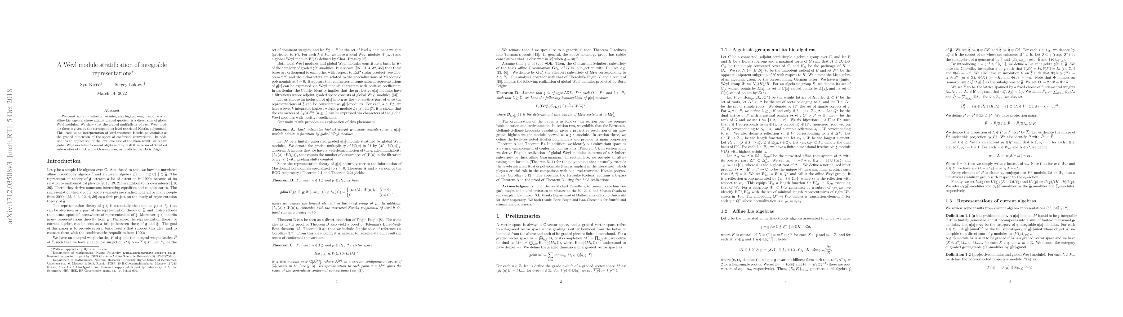 We construct a filtration on integrable highest weight module of an affine Lie algebra whose adjoint graded quotient is a direct sum of global Weyl modules. We show that the graded multiplicity of each Weyl module there is given by a corresponding level-restricted Kostka polynomial. This leads to an interpretation of level-restricted Kostka polynomials as the graded dimension of the space of conformal coinvariants. In addition, as an application of the level one case of the main result, we realize global Weyl modules of current algebras of type $\mathsf{ADE}$ in terms of Schubert manifolds of thick affine Grassmanian, as predicted by Boris Feigin.