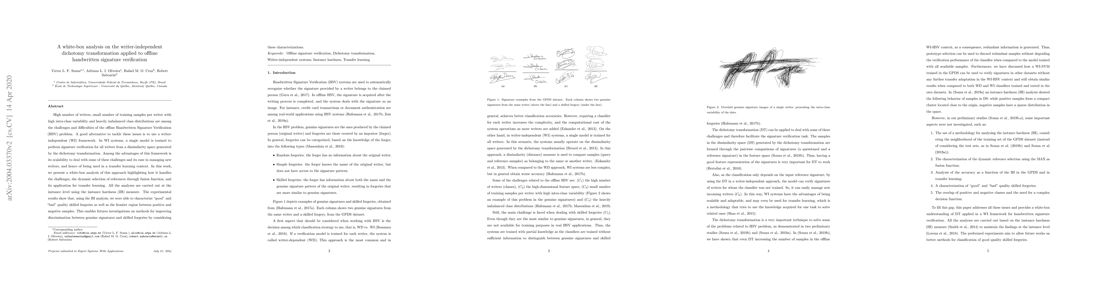 This paper conducts a white-box analysis of a writer-independent framework for offline handwritten signature verification, demonstrating its effectiveness in handling challenges like high intra-class variability and imbalanced class distributions. The study reveals that the dichotomy transformation and instance hardness measure can characterize skilled forgeries, aiding in future discrimination improvements.