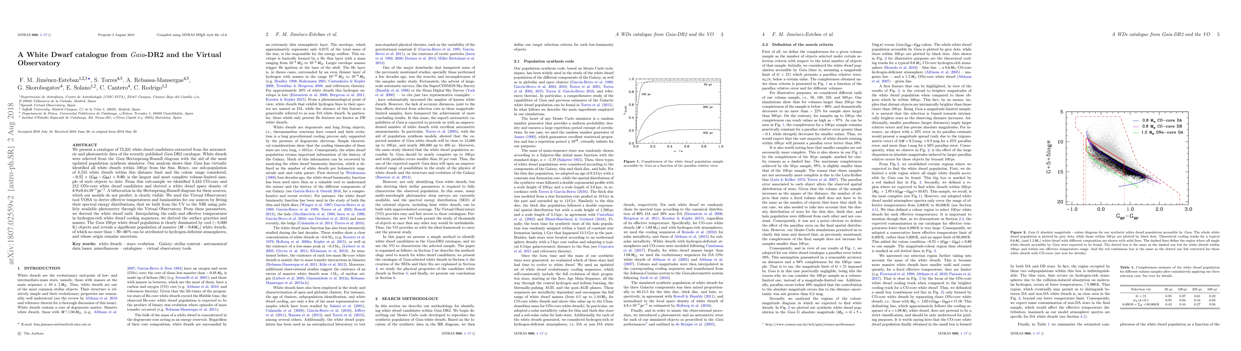 This paper presents a comprehensive catalogue of 73,221 white dwarf candidates from Gaia DR2 data, identifying 8,555 within 100 pc, the largest and most complete volume-limited sample to date. The study reveals a significant population of massive, cool white dwarfs, with an uncertain origin, and a bifurcation in the Hertzsprung-Russell diagram not predicted by models.