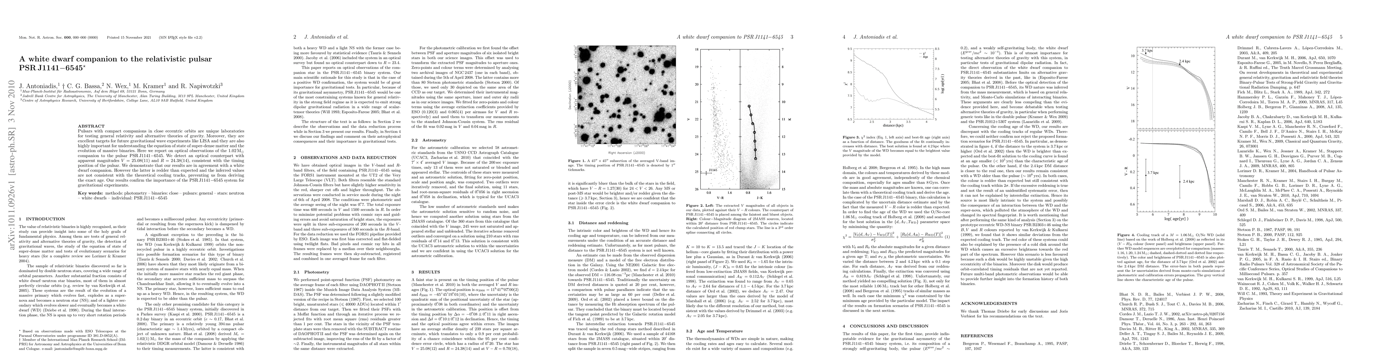 This paper reports the discovery of a white dwarf companion to the pulsar PSR J1141-6545, providing valuable data for testing general relativity and future gravitational wave experiments. However, the companion's optical properties deviate from theoretical cooling tracks, complicating age determination.
