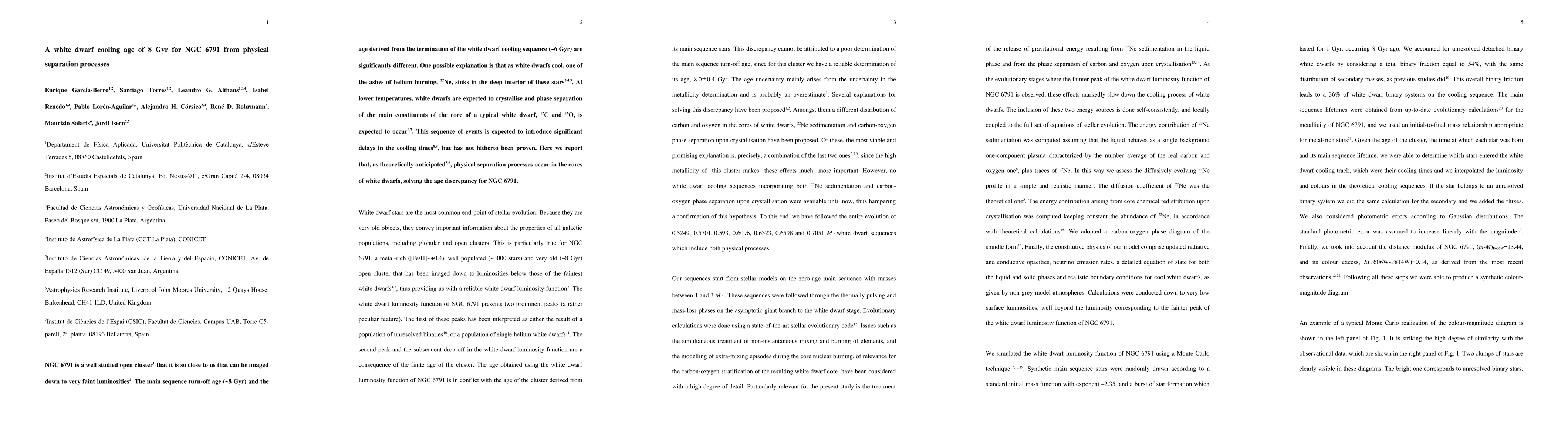 NGC 6791 is a well studied open cluster1 that it is so close to us that can be imaged down to very faint luminosities. The main sequence turn-off age (~8 Gyr) and the age derived from the termination of the white dwarf cooling sequence (~6 Gyr) are significantly different. One possible explanation is that as white dwarfs cool, one of the ashes of helium burning, 22Ne, sinks in the deep interior of these stars. At lower temperatures, white dwarfs are expected to crystallise and phase separation of the main constituents of the core of a typical white dwarf, 12C and 16O, is expected to occur. This sequence of events is expected to introduce significant delays in the cooling times, but has not hitherto been proven. Here we report that, as theoretically anticipated, physical separation processes occur in the cores of white dwarfs, solving the age discrepancy for NGC 6791.