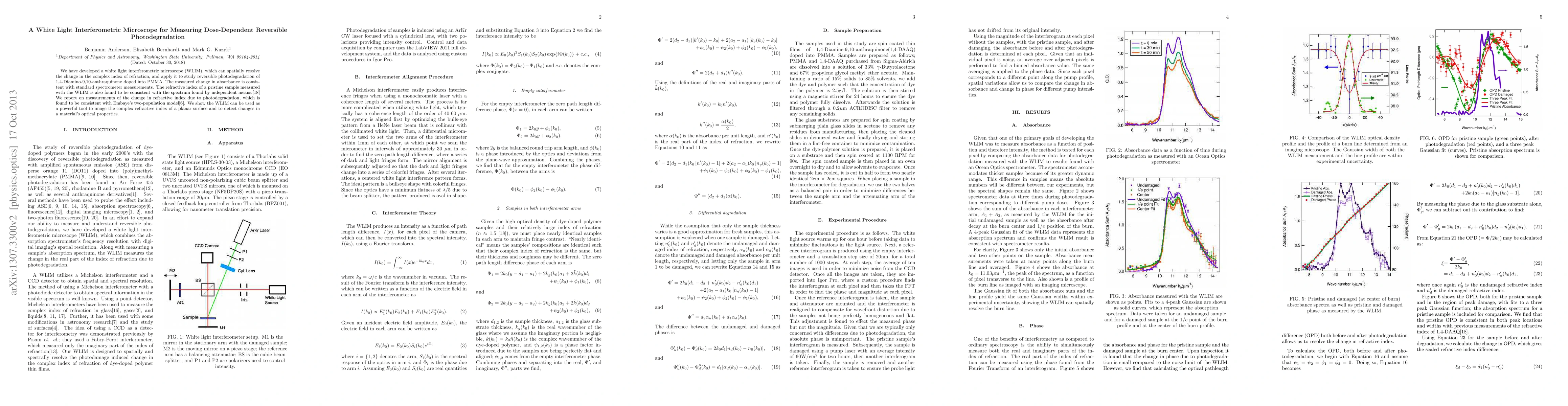This paper introduces a white light interferometric microscope (WLIM) for spatially resolving changes in the complex index of refraction, demonstrating its application in studying reversible photodegradation of 1,4-Diamino-9,10-anthraquinone in (poly)methyl methacrylate. The WLIM's measurements align with standard spectrometer and previous studies, confirming its efficacy in imaging refractive index changes and material optical properties.