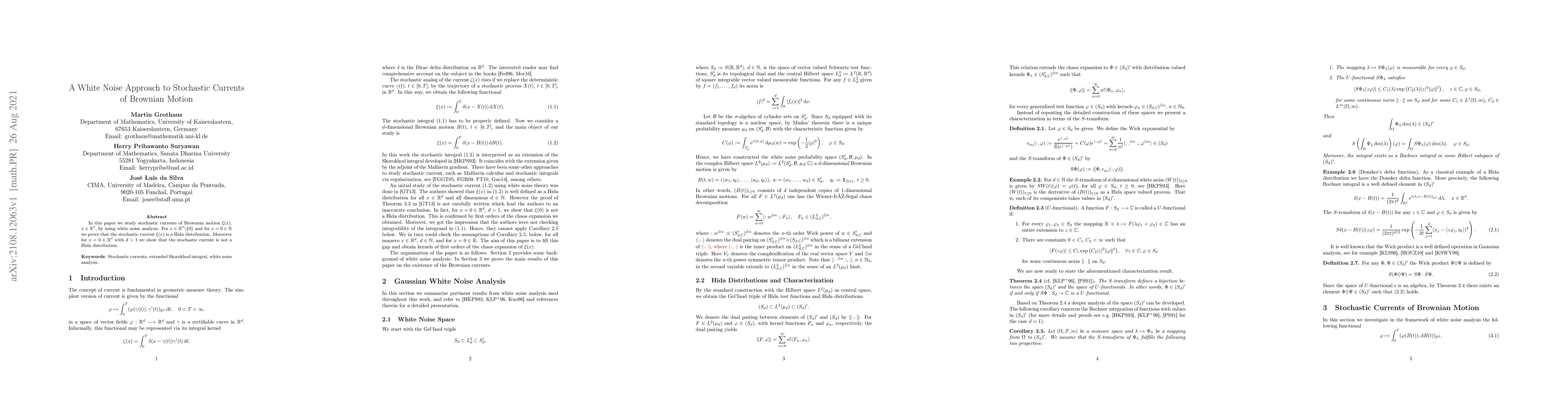 This paper employs white noise analysis to investigate stochastic currents of Brownian motion, proving that $\xi(x)$ is a Hida distribution for $x\in\mathbb{R}^{d}\backslash\{0\}$ and showing it is not for $x=0\in\mathbb{R}^{d}$ when $d>1$.