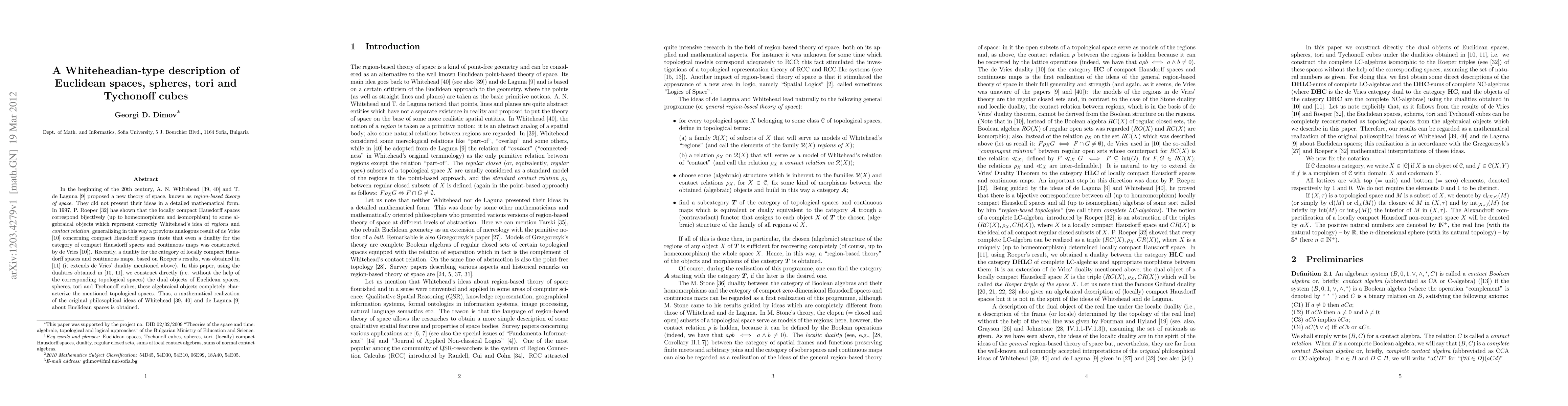 This paper constructs algebraic objects corresponding to Euclidean spaces, spheres, tori, and Tychonoff cubes using dualities based on Whitehead's and de Laguna's region-based theory of space, providing a mathematical realization of their original philosophical ideas.