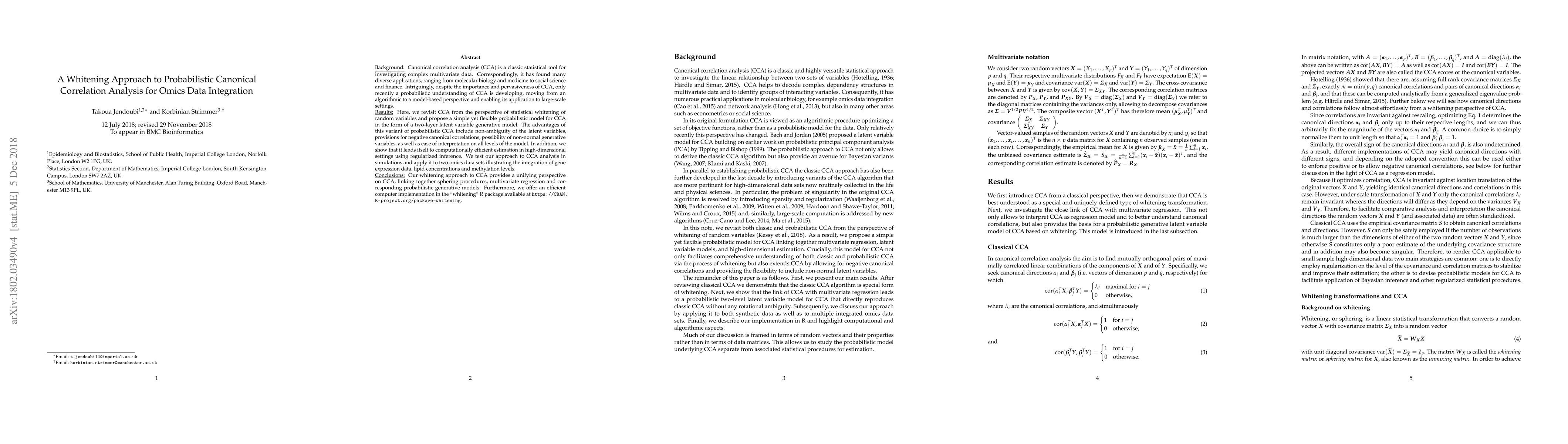 This paper proposes a probabilistic whitening approach to canonical correlation analysis (CCA) for integrating omics data. It introduces a two-layer latent variable generative model that offers non-ambiguity, supports negative correlations, and is computationally efficient for high-dimensional settings. The method is demonstrated through simulations and applications to gene expression, lipid, and methylation data.