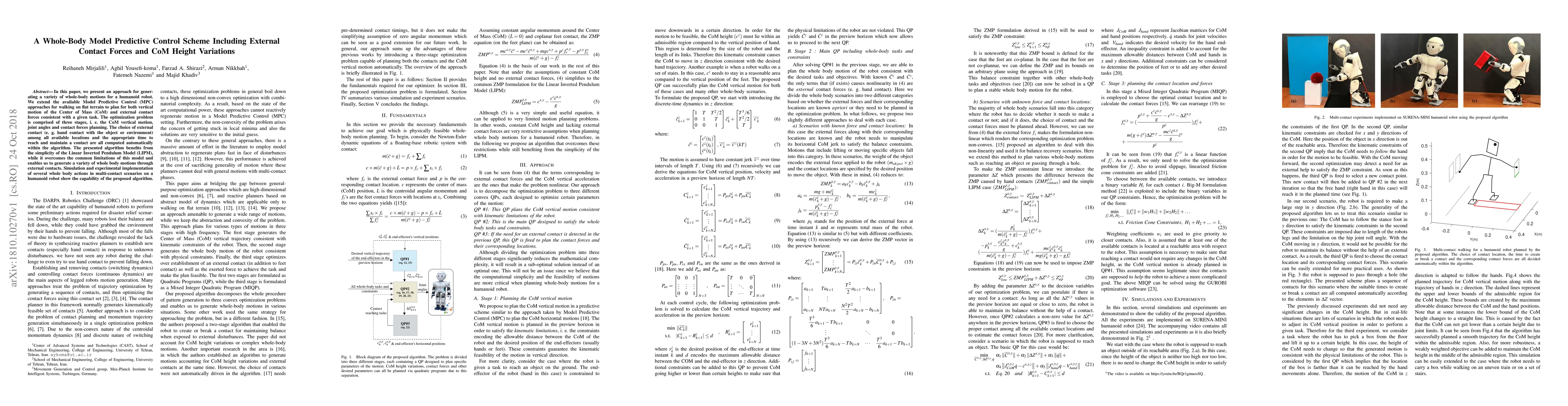 This paper proposes an extended Model Predictive Control scheme for humanoid robots that incorporates vertical motion of the Center of Mass and external contact forces, enabling a variety of whole-body motions through automated contact planning. The algorithm integrates the Linear Inverted Pendulum Model while overcoming its limitations, demonstrated through simulations and experiments on a humanoid robot.