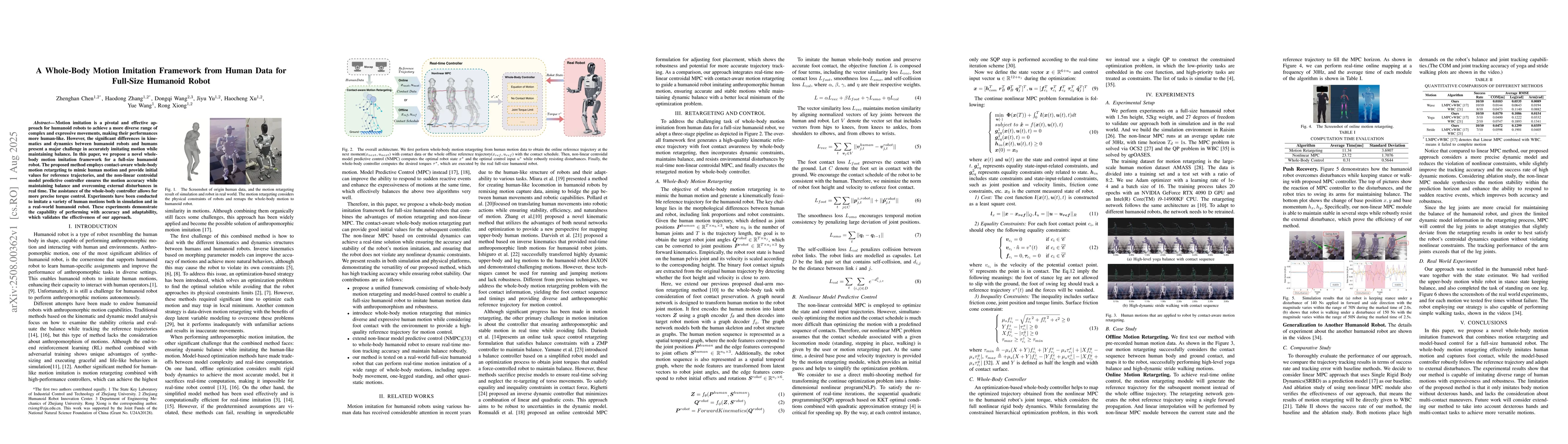 Motion imitation is a pivotal and effective approach for humanoid robots to achieve a more diverse range of complex and expressive movements, making their performances more human-like. However, the significant differences in kinematics and dynamics between humanoid robots and humans present a major challenge in accurately imitating motion while maintaining balance. In this paper, we propose a novel whole-body motion imitation framework for a full-size humanoid robot. The proposed method employs contact-aware whole-body motion retargeting to mimic human motion and provide initial values for reference trajectories, and the non-linear centroidal model predictive controller ensures the motion accuracy while maintaining balance and overcoming external disturbances in real time. The assistance of the whole-body controller allows for more precise torque control. Experiments have been conducted to imitate a variety of human motions both in simulation and in a real-world humanoid robot. These experiments demonstrate the capability of performing with accuracy and adaptability, which validates the effectiveness of our approach.