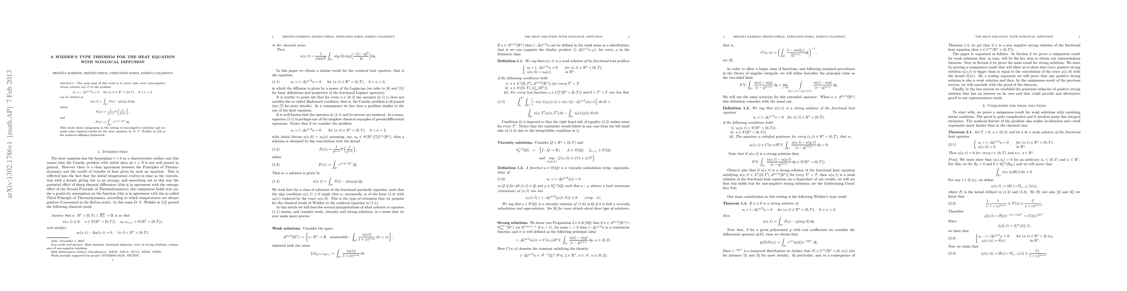 The main goal of this work is to prove that every non-negative {\it strong solution} $u(x,t)$ to the problem $$ u_t+(-\Delta)^{\alpha/2}u=0 \ \quad\mbox{for } (x,t)\in\mathbb{R}^{n}\times(0,T), \quad 0<\alpha<2, $$ can be written as $$u(x,t)=\int_{\mathbb{R}^{n}}{P_{t}(x-y)u(y,0)\, dy},$$ where $$P_{t}(x)=\frac{1}{t^{n/\alpha}}P\left(\frac{x}{t^{1/\alpha}}\right), $$ and $$ P(x):=\int_{\mathbb{R}^{n}}{e^{ix\cdot\xi-|\xi|^{\alpha}}d\xi}. $$ This result shows uniqueness in the setting of non-negative solutions and extends some classical results for the heat equation by D. V. Widder in \cite{W0} to the nonlocal diffusion framework.