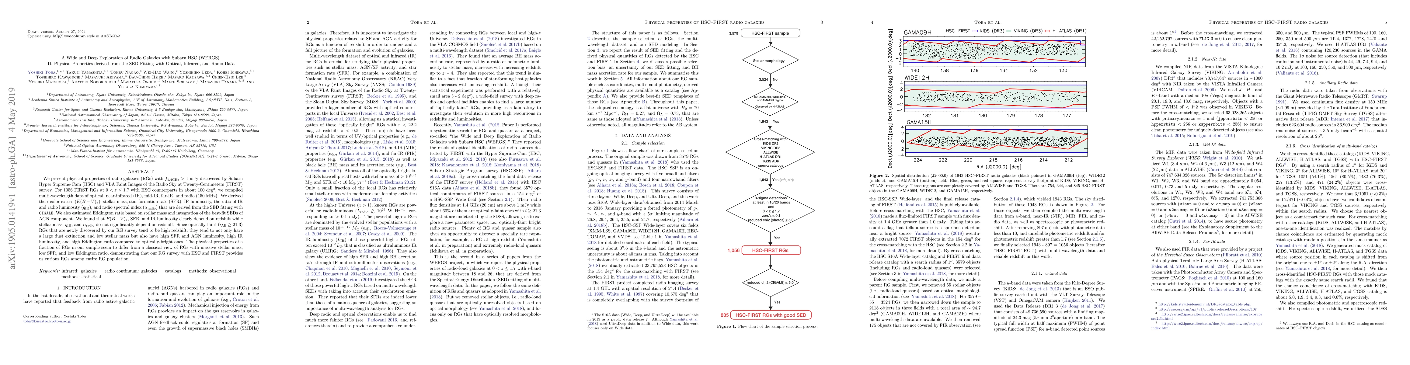 We present physical properties of radio galaxies (RGs) with $f_{\rm 1.4 GHz} >$ 1 mJy discovered by Subaru Hyper Supreme-Cam (HSC) and VLA Faint Images of the Radio Sky at Twenty-Centimeters (FIRST) survey. For 1056 FIRST RGs at $0 < z \leq 1.7$ with HSC counterparts in about 100 deg$^2$, we compiled multi-wavelength data of optical, near-infrared (IR), mid-IR, far-IR, and radio (150 MHz). We derived their color excess ($E (B-V)_{*}$), stellar mass, star formation rate (SFR), IR luminosity, the ratio of IR and radio luminosity ($q_{\rm IR}$), and radio spectral index ($\alpha_{\rm radio}$) that are derived from the SED fitting with CIGALE. We also estimated Eddington ratio based on stellar mass and integration of the best-fit SEDs of AGN component. We found that $E (B-V)_{*}$, SFR, and IR luminosity clearly depend on redshift while stellar mass, $q_{\rm IR}$, and $\alpha_{\rm radio}$ do not significantly depend on redshift. Since optically-faint ($i_{\rm AB} \geq 21.3$) RGs that are newly discovered by our RG survey tend to be high redshift, they tend to not only have a large dust extinction and low stellar mass but also have high SFR and AGN luminosity, high IR luminosity, and high Eddington ratio compared to optically-bright ones. The physical properties of a fraction of RGs in our sample seem to differ from a classical view of RGs with massive stellar mass, low SFR, and low Eddington ratio, demonstrating that our RG survey with HSC and FIRST provides us curious RGs among entire RG population.