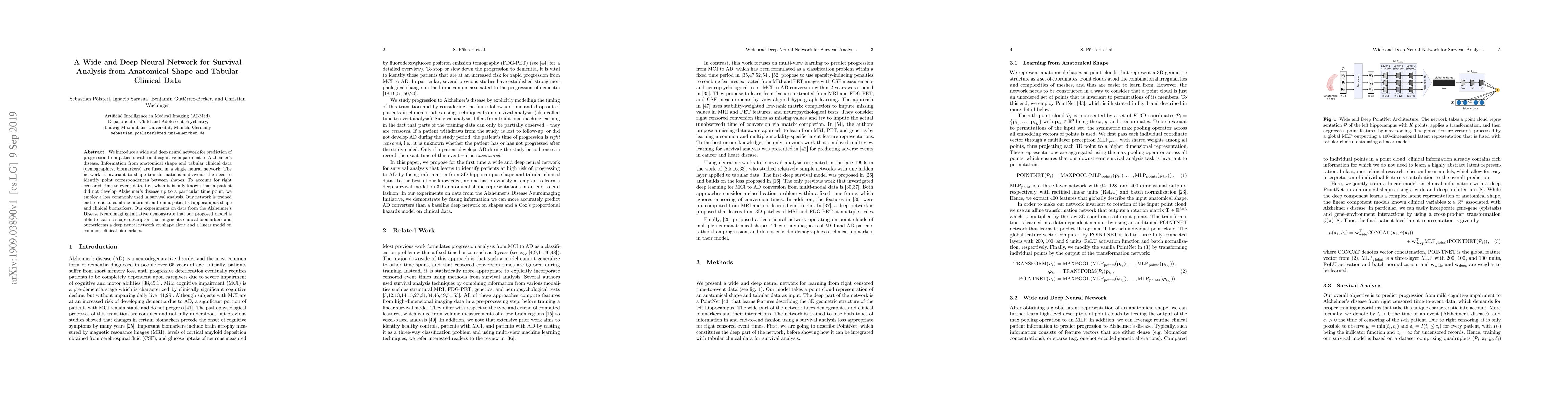 We introduce a wide and deep neural network for prediction of progression from patients with mild cognitive impairment to Alzheimer's disease. Information from anatomical shape and tabular clinical data (demographics, biomarkers) are fused in a single neural network. The network is invariant to shape transformations and avoids the need to identify point correspondences between shapes. To account for right censored time-to-event data, i.e., when it is only known that a patient did not develop Alzheimer's disease up to a particular time point, we employ a loss commonly used in survival analysis. Our network is trained end-to-end to combine information from a patient's hippocampus shape and clinical biomarkers. Our experiments on data from the Alzheimer's Disease Neuroimaging Initiative demonstrate that our proposed model is able to learn a shape descriptor that augments clinical biomarkers and outperforms a deep neural network on shape alone and a linear model on common clinical biomarkers.