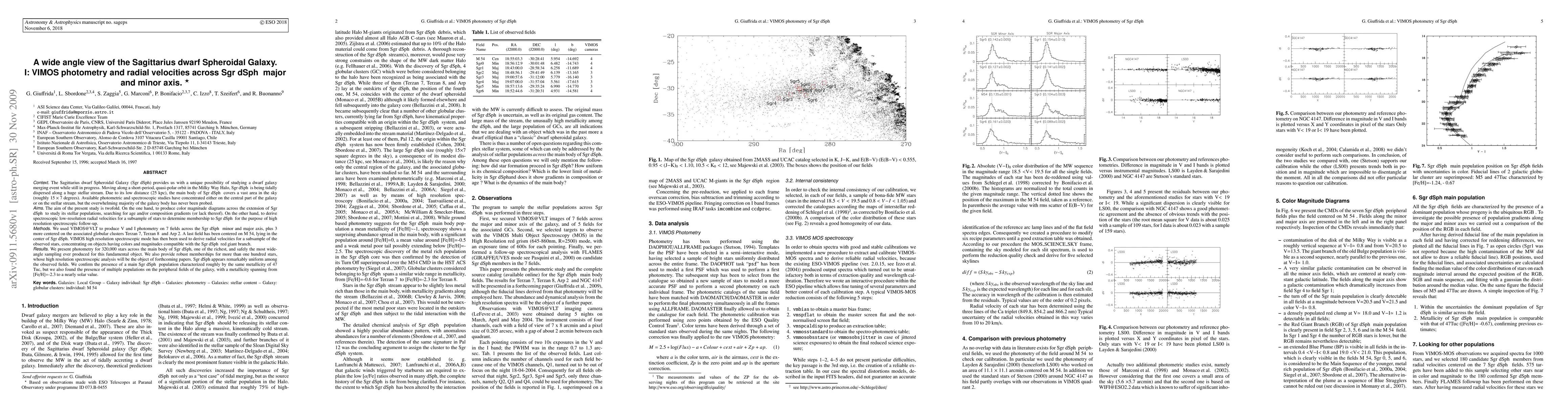 The Sagittarius dwarf Spheroidal Galaxy (Sgr dSph) provides us with a unique possibility of studying a dwarf galaxy merging event while still in progress. Due to its low distance (25 kpc), the main body of Sgr dSph covers a vast area in the sky (roughly 15 x 7 degrees). Available photometric and spectroscopic studies have concentrated either on the central part of the galaxy or on the stellar stream, but the overwhelming majority of the galaxy body has never been probed. The aim of the present study is twofold. On the one hand, to produce color magnitude diagrams across the extension of Sgr dSph to study its stellar populations, searching for age and/or composition gradients (or lack thereof). On the other hand, to derive spectroscopic low-resolution radial velocities for a subsample of stars to determine membership to Sgr dSph for the purpose of high resolution spectroscopic follow-up. We used VIMOS-VLT to produce V and I photometry and spectroscopy on 7 fields across the Sgr dSph minor and major axis, plus 3 more centered on the associated globular clusters Terzan 7, Terzan 8 and Arp 2. A last field has been centered on M 54, lying in the center of Sgr dSph. We present photometry for 320,000 stars across the main body of Sgr dSph, one of the richest, and safely the most wide-angle sampling ever produced for this fundamental object. We also provide robust memberships for more than one hundred stars, whose high resolution spectroscopic analysis will be the object of forthcoming papers. Sgr dSph appears remarkably uniform among the observed fields. We confirm the presence of a main Sgr dSph population characterized roughly by the same metallicity of 47 Tuc, but we also found the presence of multiple populations on the peripheral fields of the galaxy, with a metallicity spanning from [Fe/H]=-2.3 to a nearly solar value.