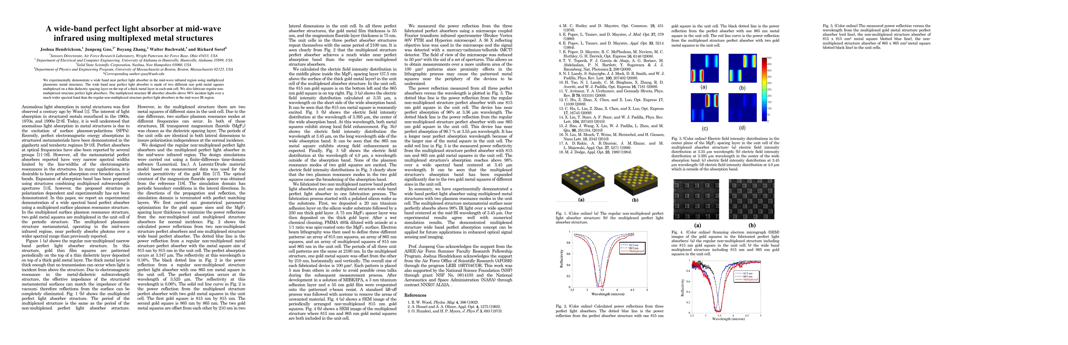 This research demonstrates a wide-band, near-perfect light absorber in the mid-wave infrared using multiplexed plasmonic metal structures. The absorber, composed of two sizes of gold squares on a dielectric layer, achieves over 98% absorption efficiency over a broader spectral band compared to non-multiplexed counterparts.