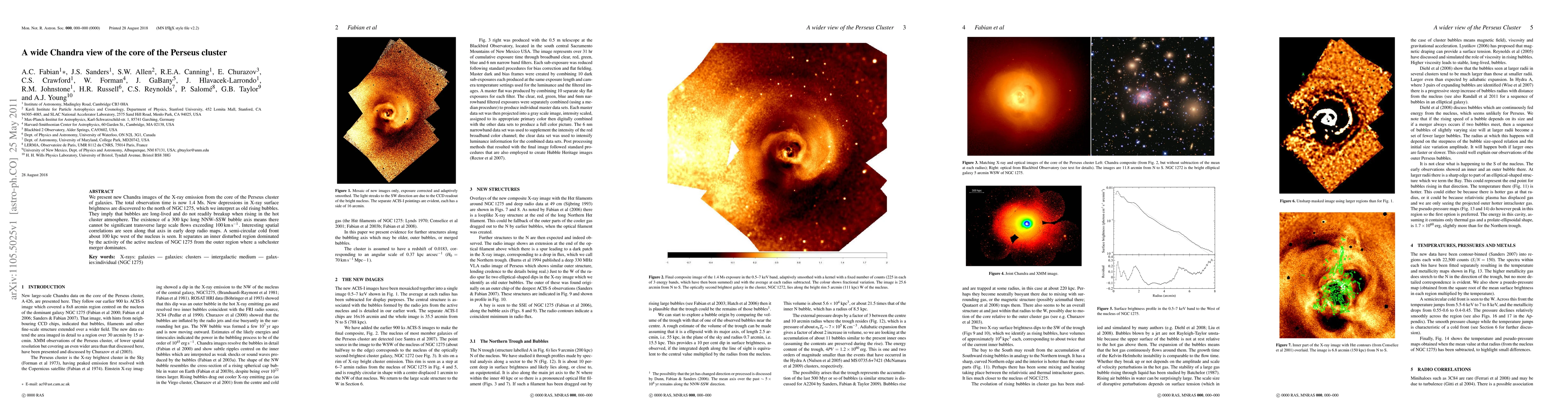 We present new Chandra images of the X-ray emission from the core of the Perseus cluster of galaxies. The total observation time is now 1.4 Ms. New depressions in X-ray surface brightness are discovered to the north of NGC1275, which we interpret as old rising bubbles. They imply that bubbles are long-lived and do not readily breakup when rising in the hot cluster atmosphere. The existence of a 300 kpc long NNW-SSW bubble axis means there cannot be significant transverse large scale flows exceeding 100 km/s. Interesting spatial correlations are seen along that axis in early deep radio maps. A semi-circular cold front about 100 kpc west of the nucleus is seen. It separates an inner disturbed region dominated by the activity of the active nucleus of NGC1275 from the outer region where a subcluster merger dominates.