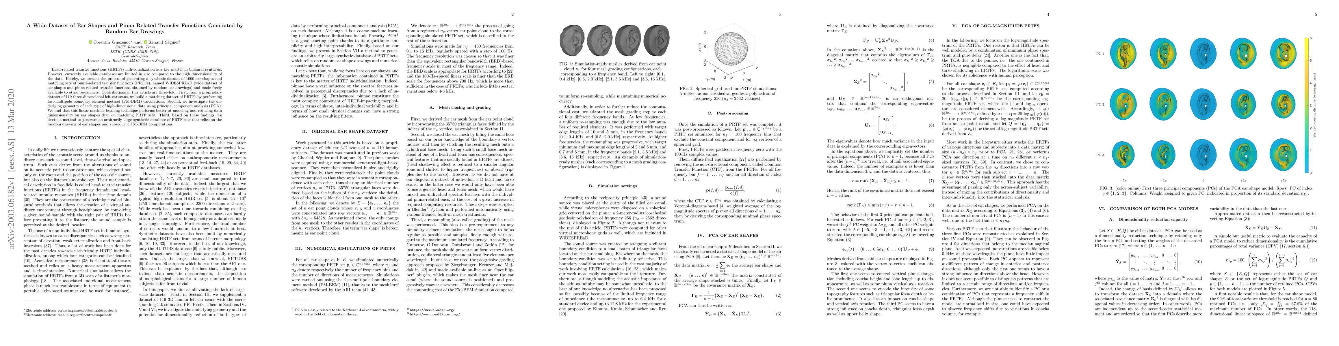 This paper presents a synthetic dataset, WiDESPREaD, comprising 1000 ear shapes and corresponding pinna-related transfer functions (PRTFs) generated via random ear drawings. The authors utilize a proprietary dataset to build PRTFs through fast-multipole boundary element method calculations and employ PCA to analyze data dimensionality, ultimately devising a method for creating large synthetic PRTF databases.