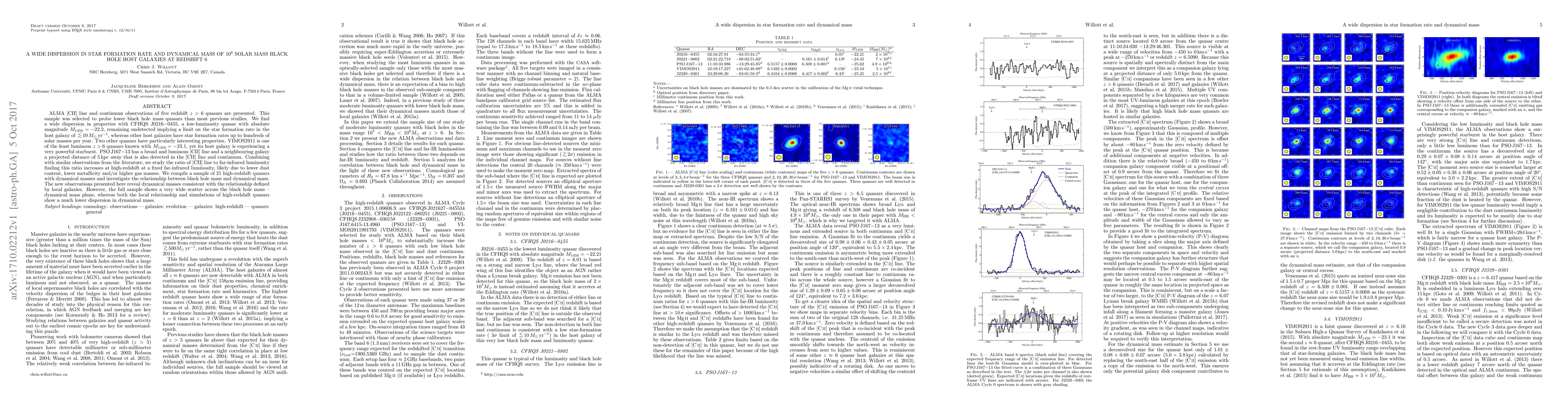 ALMA [CII] line and continuum observations of five redshift z>6 quasars are presented. This sample was selected to probe lower black hole mass quasars than most previous studies. We find a wide dispersion in properties with CFHQS J0216-0455, a low-luminosity quasar with absolute magnitude M_1450=-22.2, remaining undetected implying a limit on the star formation rate in the host galaxy of <10 solar masses per year, whereas other host galaxies have star formation rates up to hundreds of solar masses per year. Two other quasars have particularly interesting properties. VIMOS2911 is one of the least luminous z>6 quasars known with M_1450=-23.1, yet its host galaxy is experiencing a very powerful starburst. PSO J167-13 has a broad and luminous [CII] line and a neighbouring galaxy a projected distance of 5kpc away that is also detected in the [CII] line and continuum. Combining with similar observations from the literature, we study the ratio of [CII] line to far-infrared luminosity finding this ratio increases at high-redshift at a fixed far-infrared luminosity, likely due to lower dust content, lower metallicity and/or higher gas masses. We compile a sample of 21 high-redshift quasars with dynamical masses and investigate the relationship between black hole mass and dynamical mass. The new observations presented here reveal dynamical masses consistent with the relationship defined by local galaxies. However, the full sample shows a very wide scatter across the black hole mass - dynamical mass plane, whereas both the local relationship and simulations of high-redshift quasars show a much lower dispersion in dynamical mass.