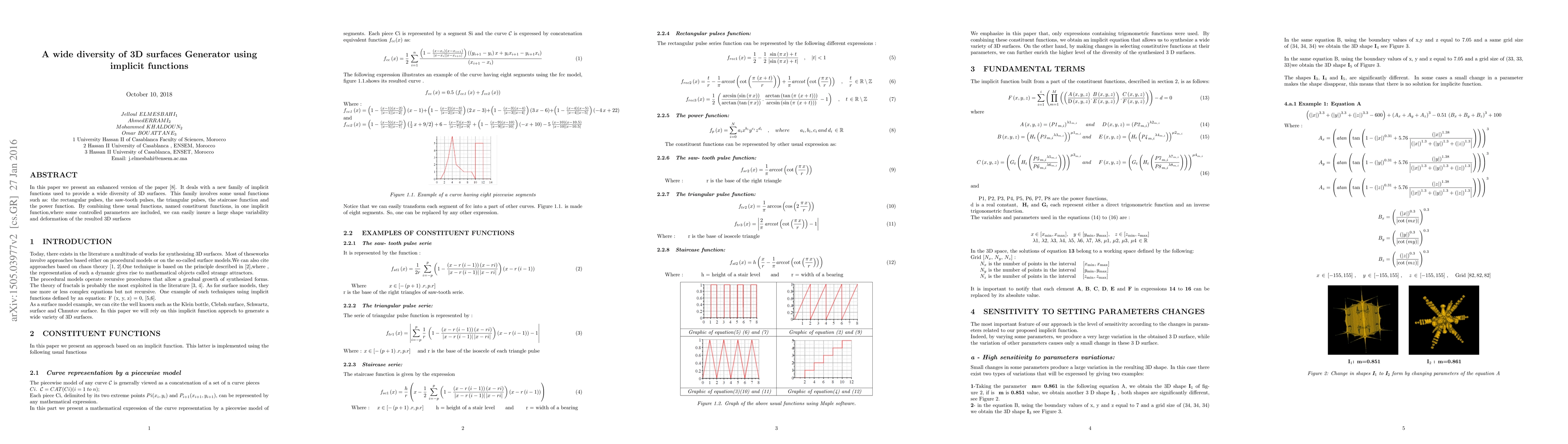 We present in this paper a new family of implicit function for synthesizing a wide variety of 3D surfaces. The basis of this family consists of the usual functions that are: the function rectangular pulses, the function saw-tooth pulses, the function of triangular pulses, the staircase function and the power function. By combining these common functions, named constituent functions, in one implicit function and by varying some parameters of this function we can synthesize a wide variety of 3D surfaces with the possibility to set their deformations.