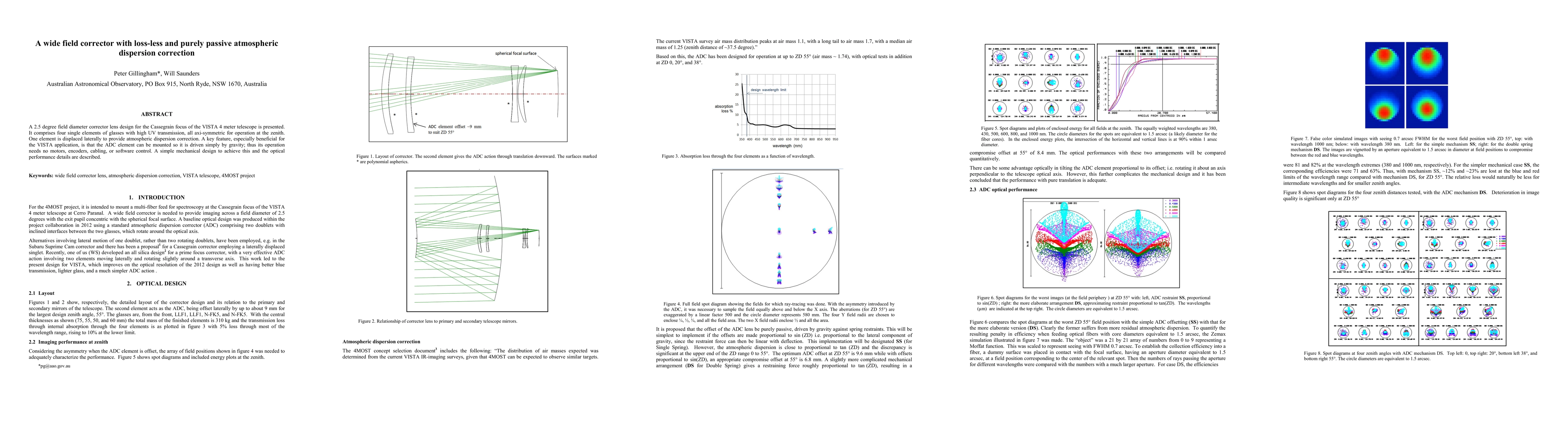 This paper presents a design for a wide field corrector lens for the VISTA telescope, featuring four high UV transmission glass elements. The design includes a purely passive atmospheric dispersion correction element driven by gravity, eliminating the need for motors or software control.
