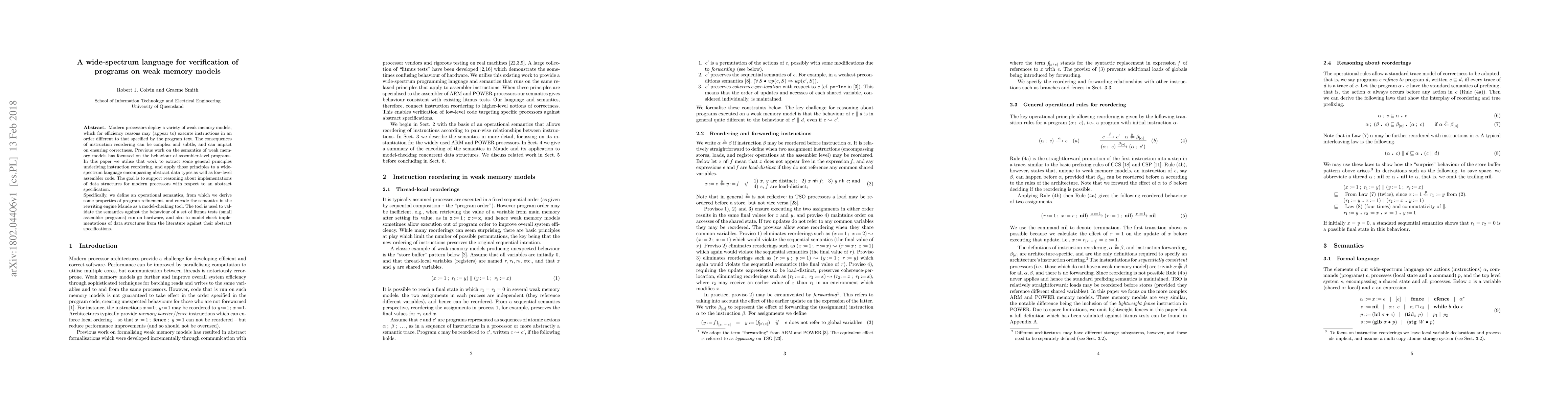 This paper develops a wide-spectrum language for verifying program correctness on weak memory models, defining operational semantics and encoding it in Maude for model-checking. The tool is validated against litmus tests and used to check data structures against their specifications.