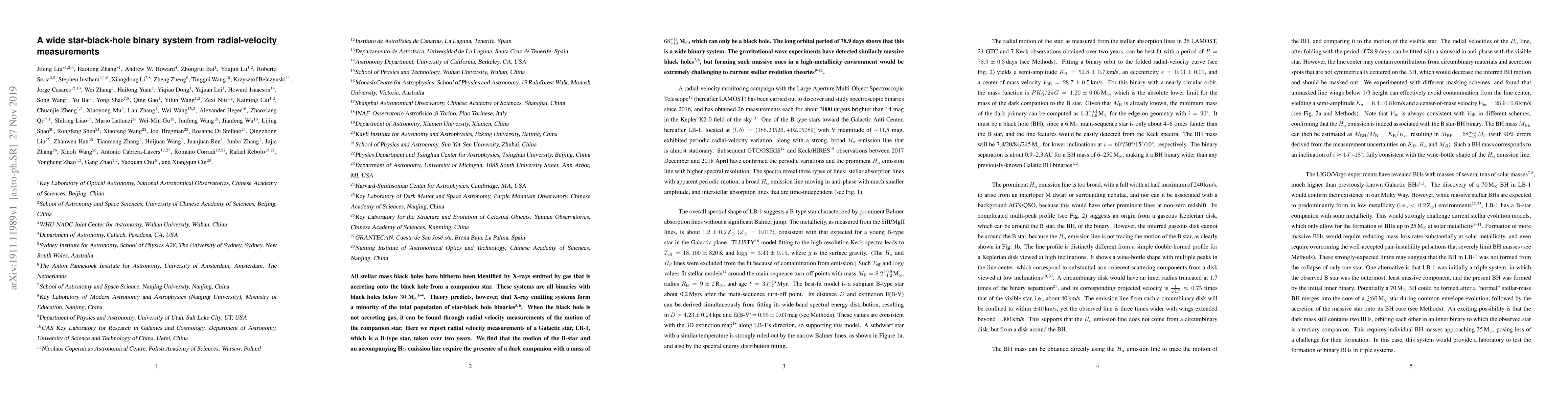 This paper reports the discovery of a wide star-black-hole binary system, LB-1, using radial velocity measurements. The companion to the B-type star is inferred to be a black hole with a mass of 68 M$_{\odot}$, challenging current stellar evolution theories.