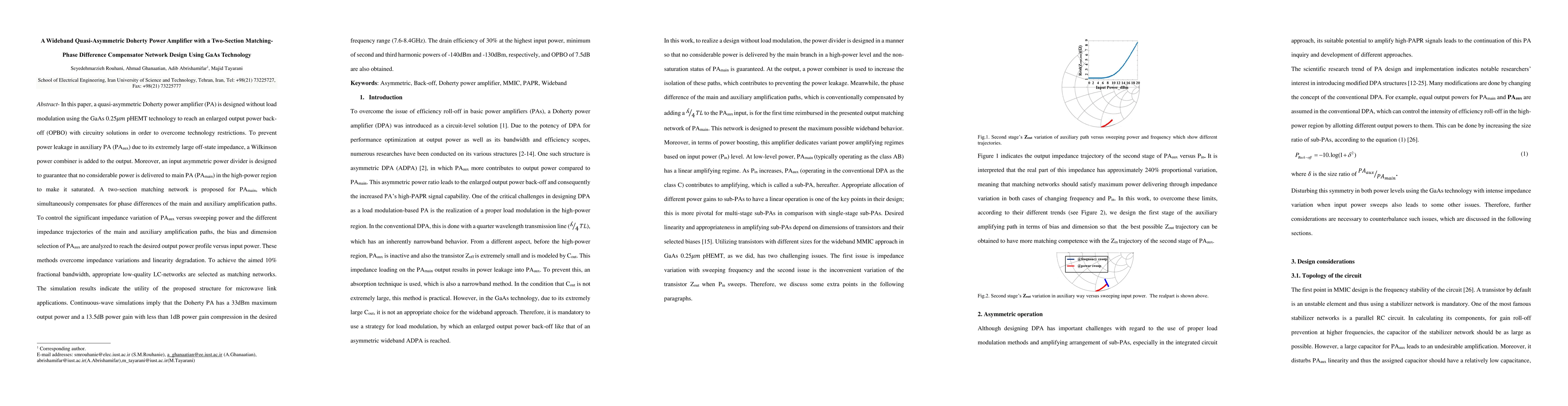 This paper designs a quasi-asymmetric Doherty power amplifier using GaAs technology to enhance output power back-off and efficiency. The design includes a Wilkinson combiner and a two-section matching network to manage phase differences and impedance variations, achieving a 33dBm maximum output power and 30% drain efficiency.