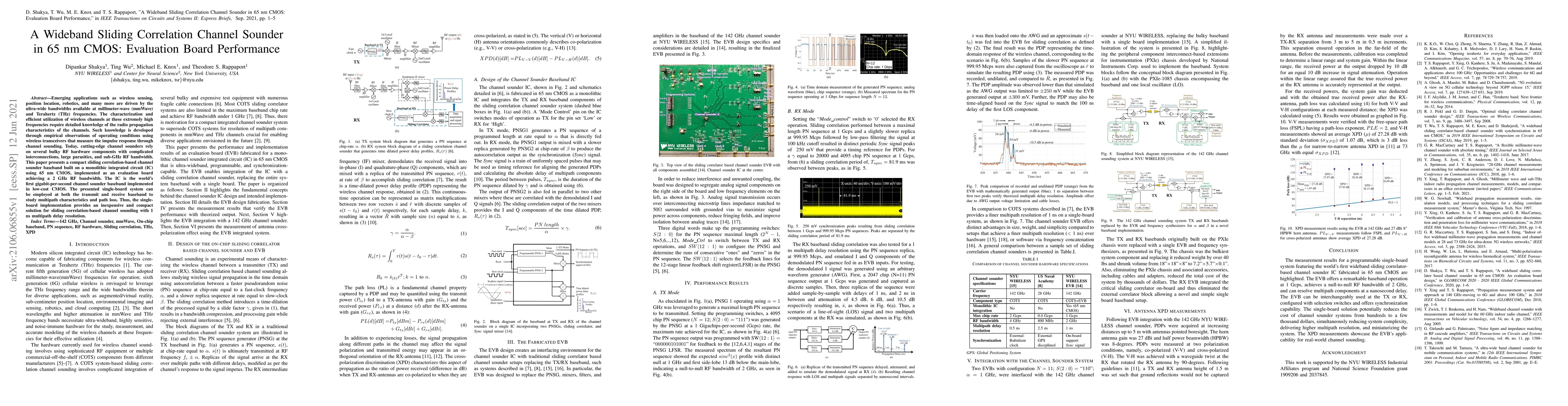 This paper introduces a compact, low-cost sliding correlation channel sounder in 65 nm CMOS, achieving a 2 GHz RF bandwidth and 1 ns multipath delay resolution, offering an inexpensive solution for studying wireless channel characteristics at millimeter-wave and Terahertz frequencies. The single-board system is the first gigabit-per-second channel sounder baseband implemented in CMOS.