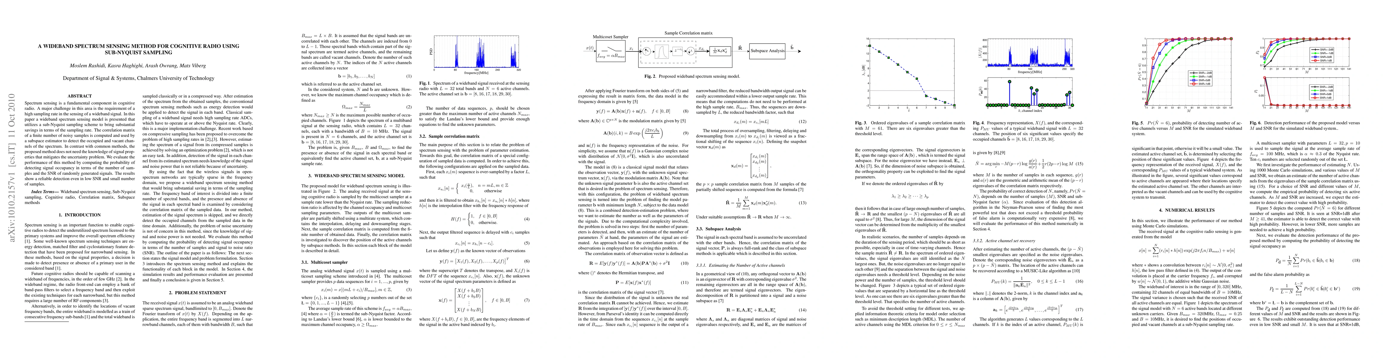 This paper proposes a wideband spectrum sensing method for cognitive radio using sub-Nyquist sampling to reduce the required sampling rate. It employs a subspace estimator based on the correlation matrix of noisy samples, achieving reliable signal occupancy detection without needing prior signal property knowledge.