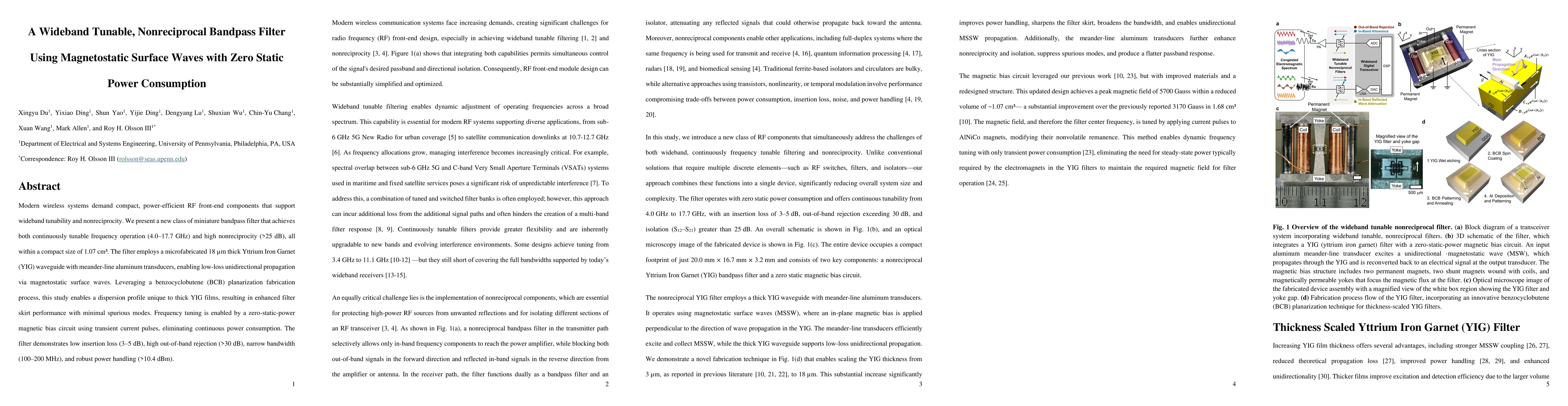 This work is novel due to its combination of wideband tunability, nonreciprocity, and zero static power consumption in a compact form factor, utilizing a unique dispersion profile from thick YIG films.